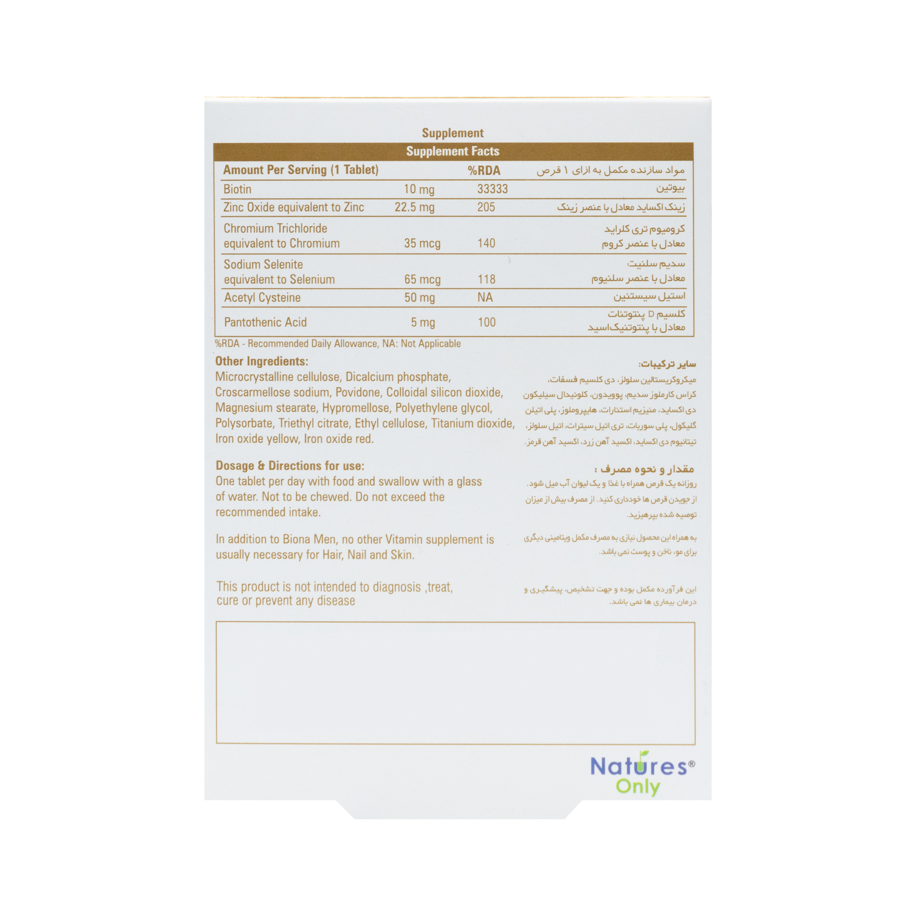 قرص بایونا من نیچرز اونلی یک مکمل غذایی است که با تامین ویتامینها و مواد معدنی مورد نیاز بدن، به حفظ سلامت پوست، مو و ناخن و تقویت سیستم ایمنی مردان کمک میکند.