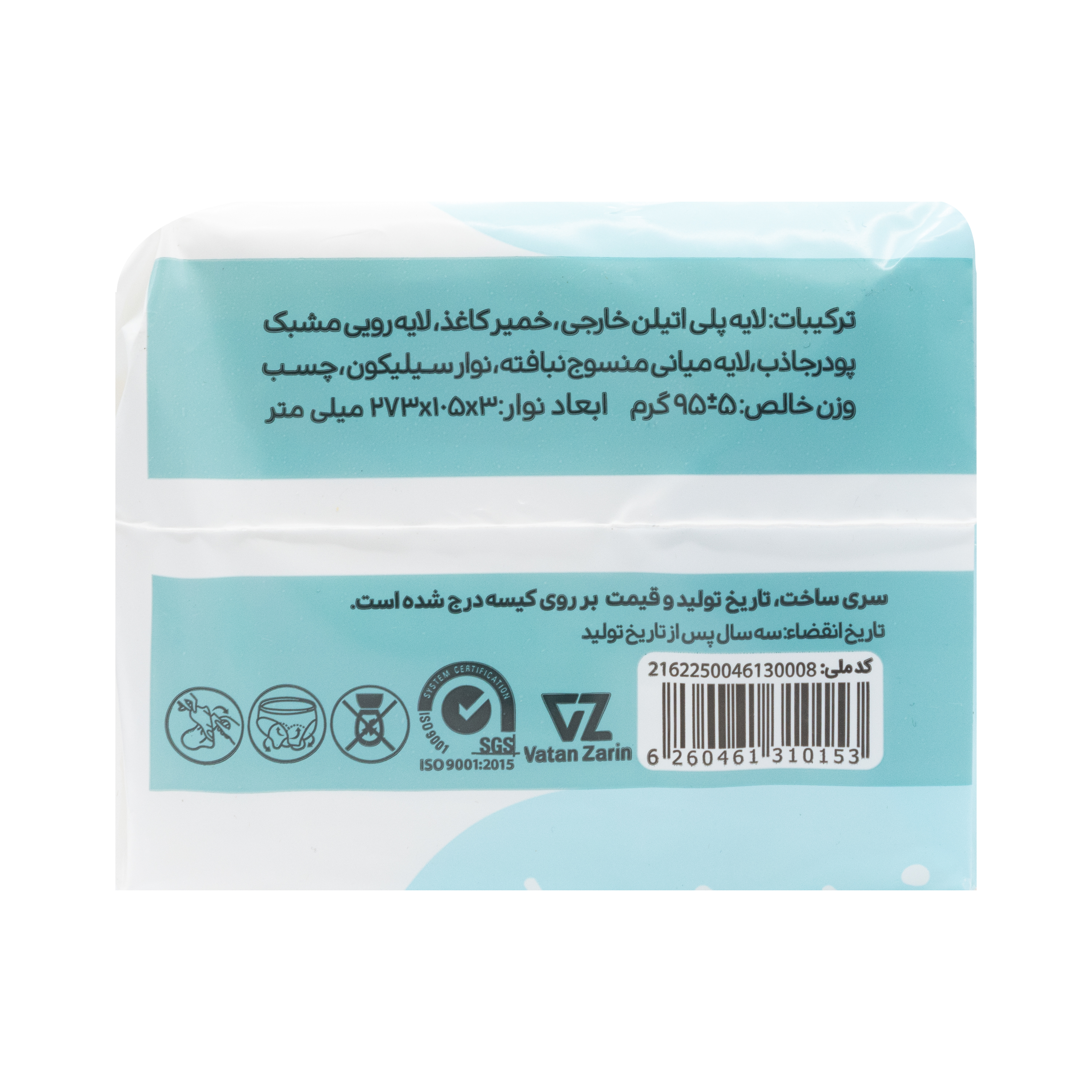 لایه پلی اتیلن خارجی، خمیر کاغذ، لایه رویی مشبک، پودر جاذب، لایه میانی منسوج نبافته، نوار سیلیکون، چسب
