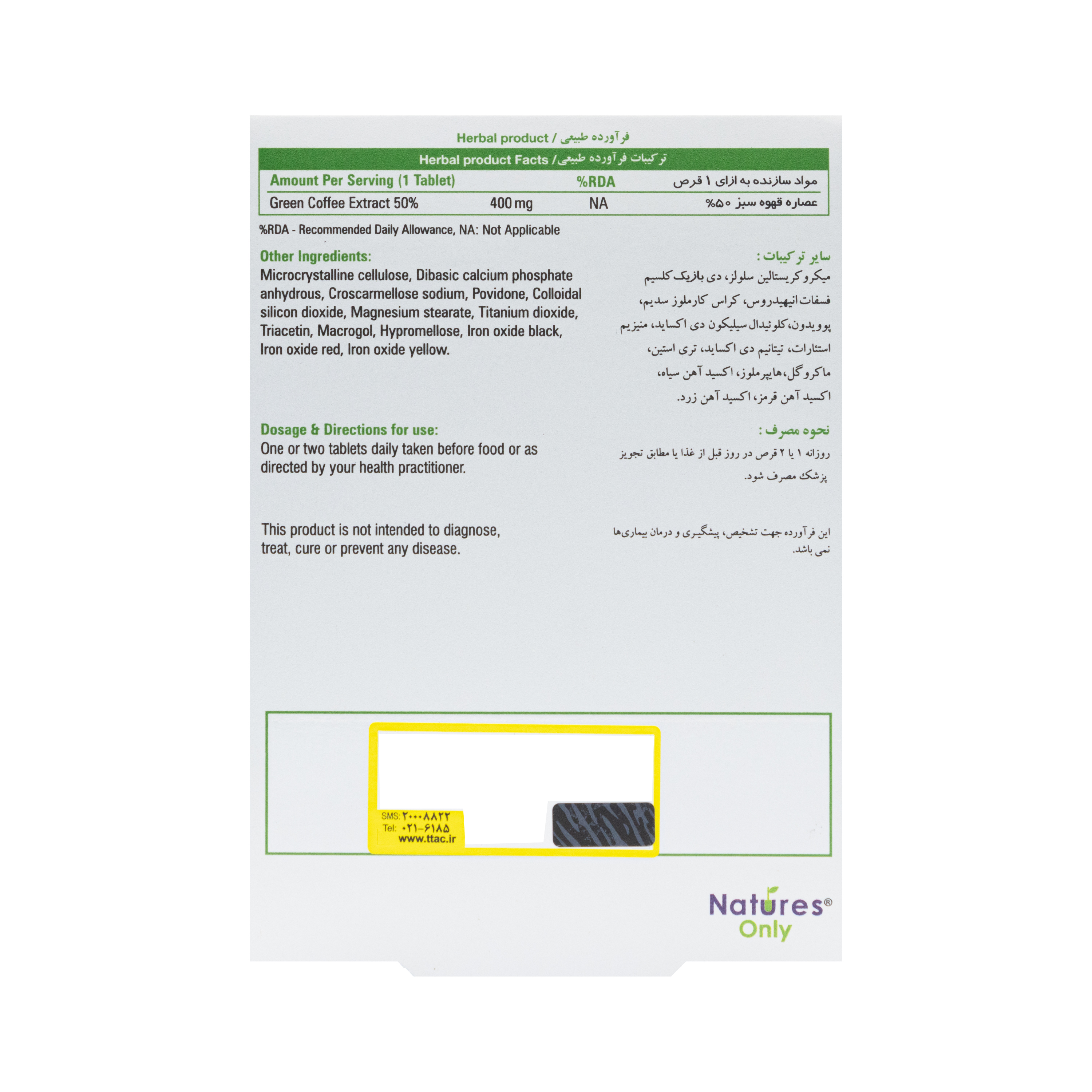 | عصاره قهوه سبز 50% | NA | 400mg | Green Coffee Extract 50% |