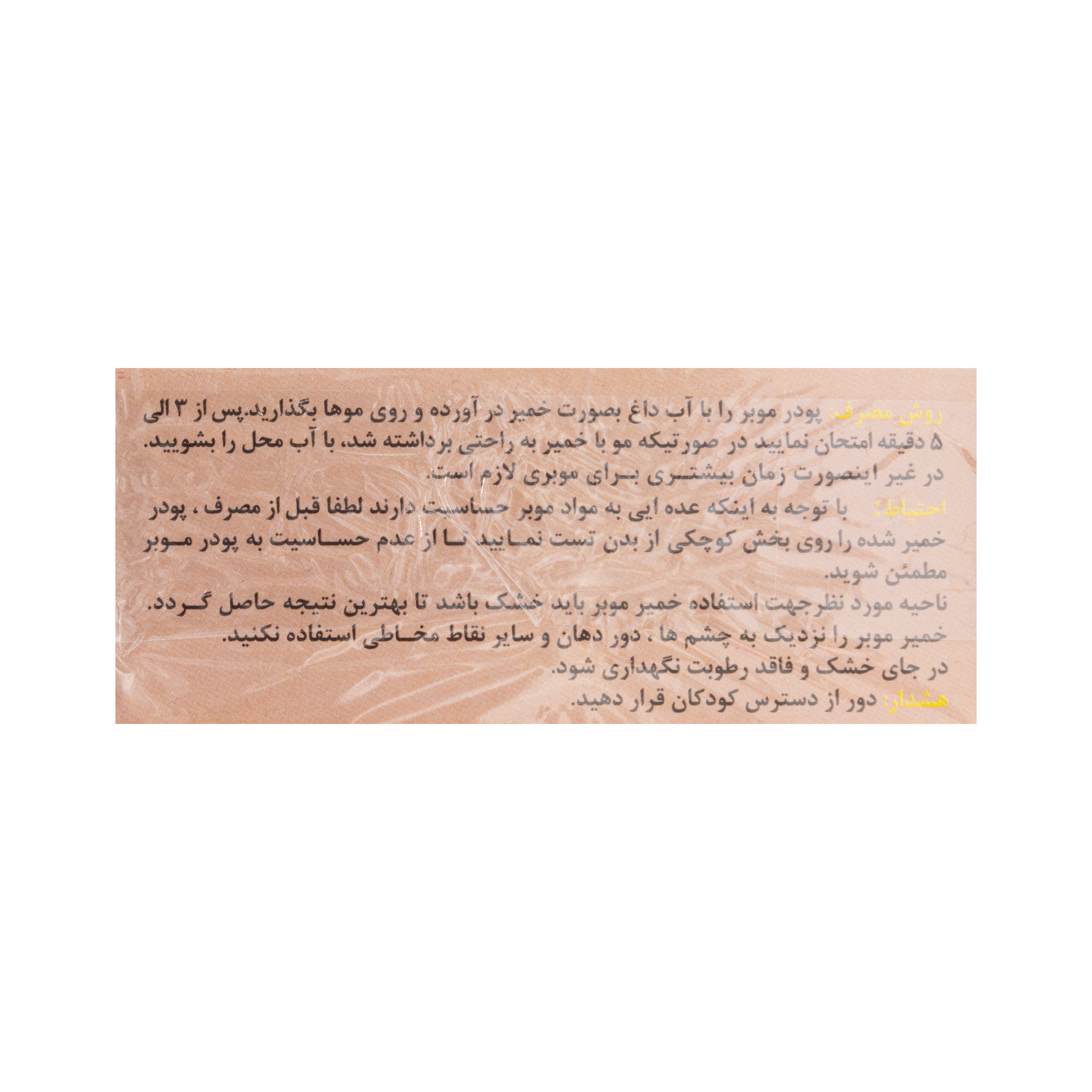 - پودر موبر را با آب داغ بصورت خمیر در آورده و روی موها بگذارید. پس از 3 الی 5 دقیقه امتحان نمایید.