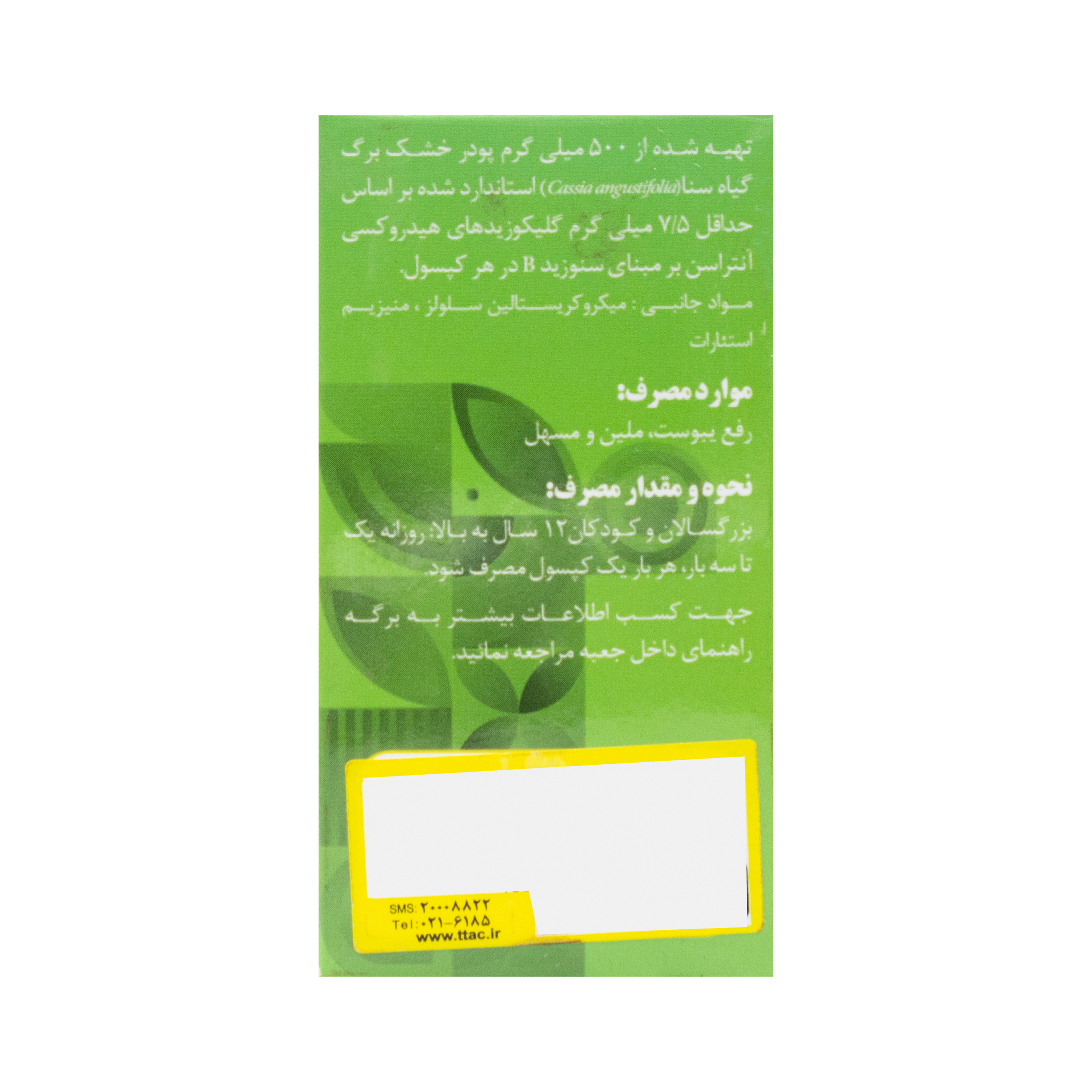 | استاندارد شده بر اساس حداقل 7.5 میلی گرم گلیکوزیدهای هیدروکسی آنتراسن بر مبنای سنوزید B در هر کپسول | |