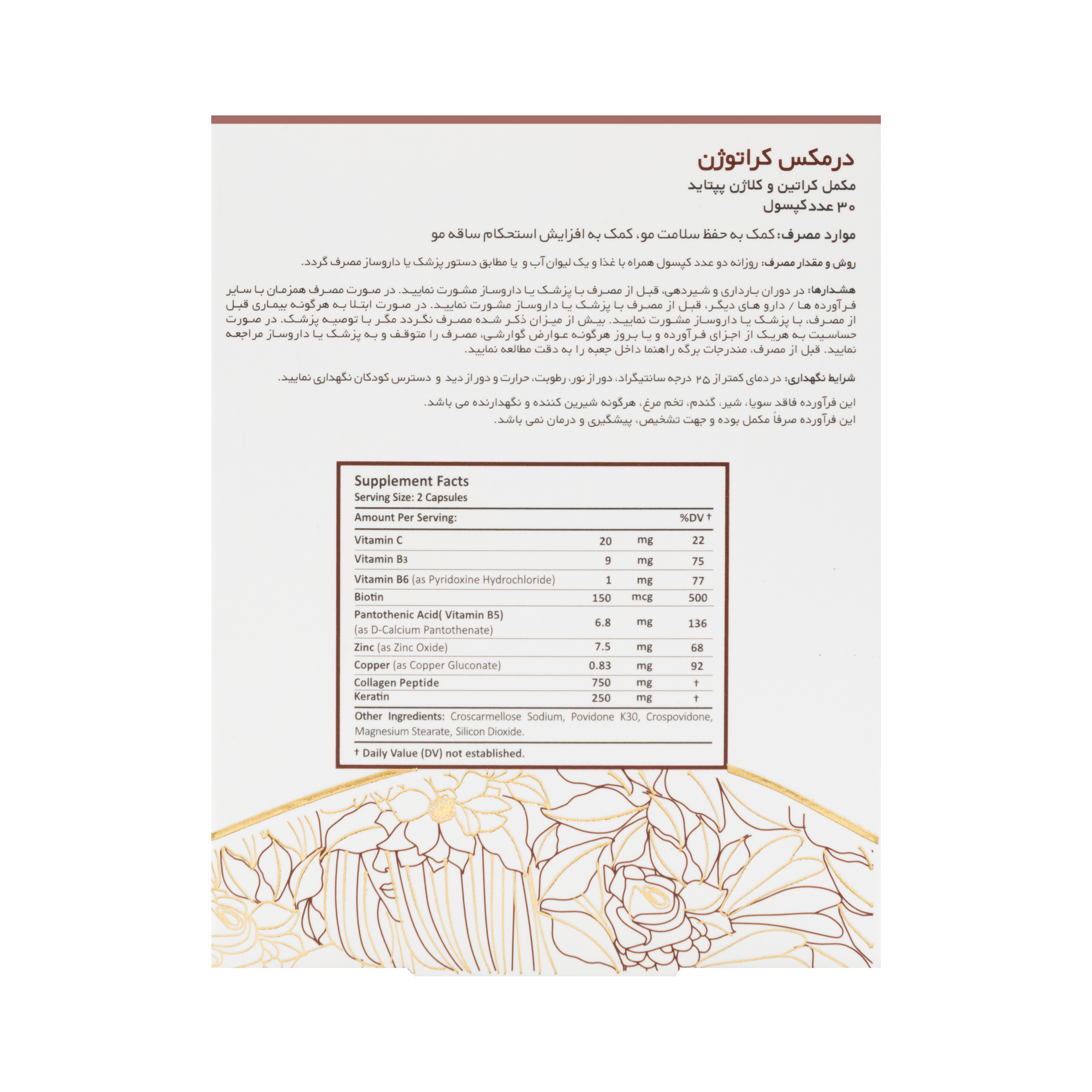 این کپسول یک مکمل غذایی است که برای تقویت موها و بهبود سلامت آنها فرموله شده است. این محصول با تأمین مواد مغذی ضروری برای مو، به رشد بهتر، ضخیمتر شدن تارهای مو و کاهش ریزش کمک میکند. کپسول کراتوژن درمکس محتوی ویتامینها و مواد معدنی مهمی برای کمک به حفظ سلامت مو و افزایش استحکام ساقه موها میباشد.