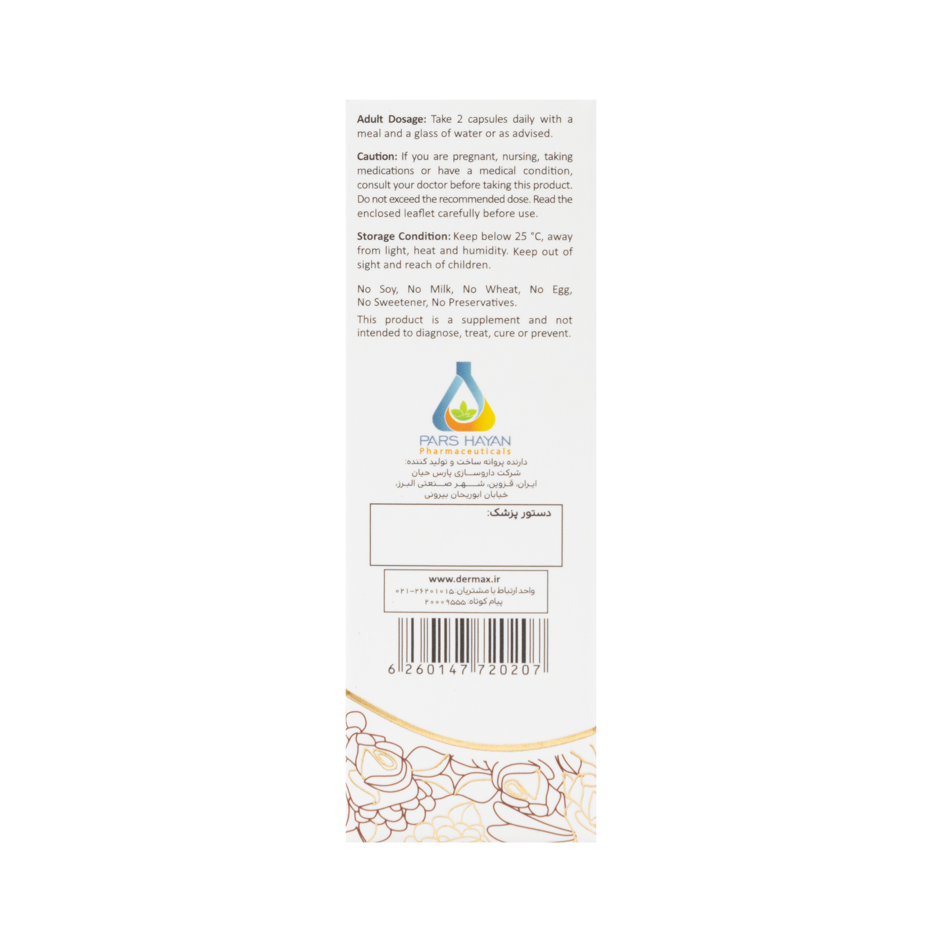 کپسول کراتوژن درمکس ساخت ایران و محصولی از شرکت داروسازی پارس حیان میباشد. هر جعبه این محصول حاوی 30 عدد کپسول قهوهای رنگ است. یکی از مزایای درمکس کراتوژن این است که فاقد سویا، شیر، گندم، تخم مرغ، هرگونه شیرین کننده و نگهدارنده میباشد، از همین رو برای مصرف افرادی که به این مواد حساسیت دارند نیز مناسب است.