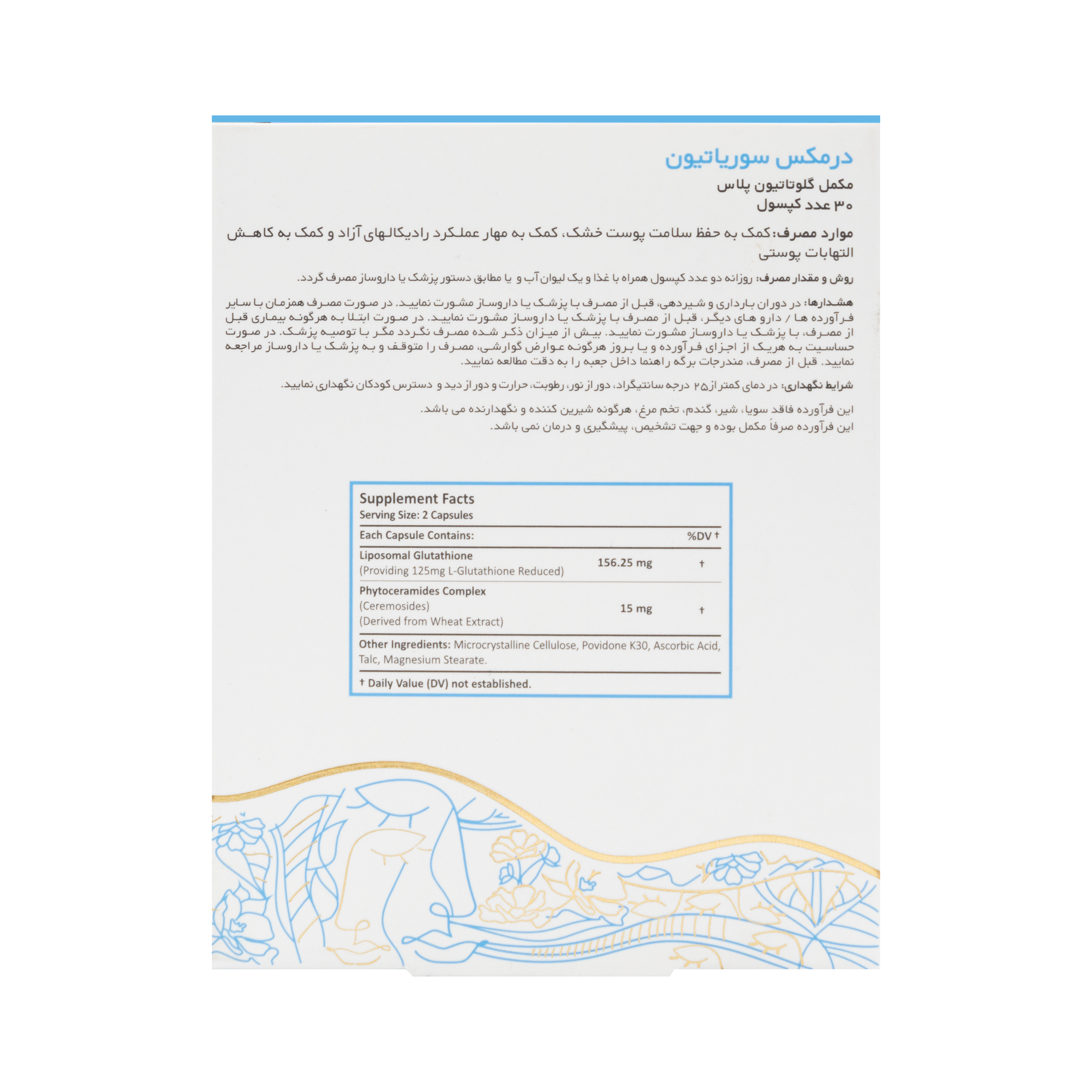 - 156.25 میلیگرم گلوتاتیون لیپوزومال (Liposomal Glutathione) و 15 میلیگرم کمپلکس فیتوسرامید(Phytoceramides Complex)
