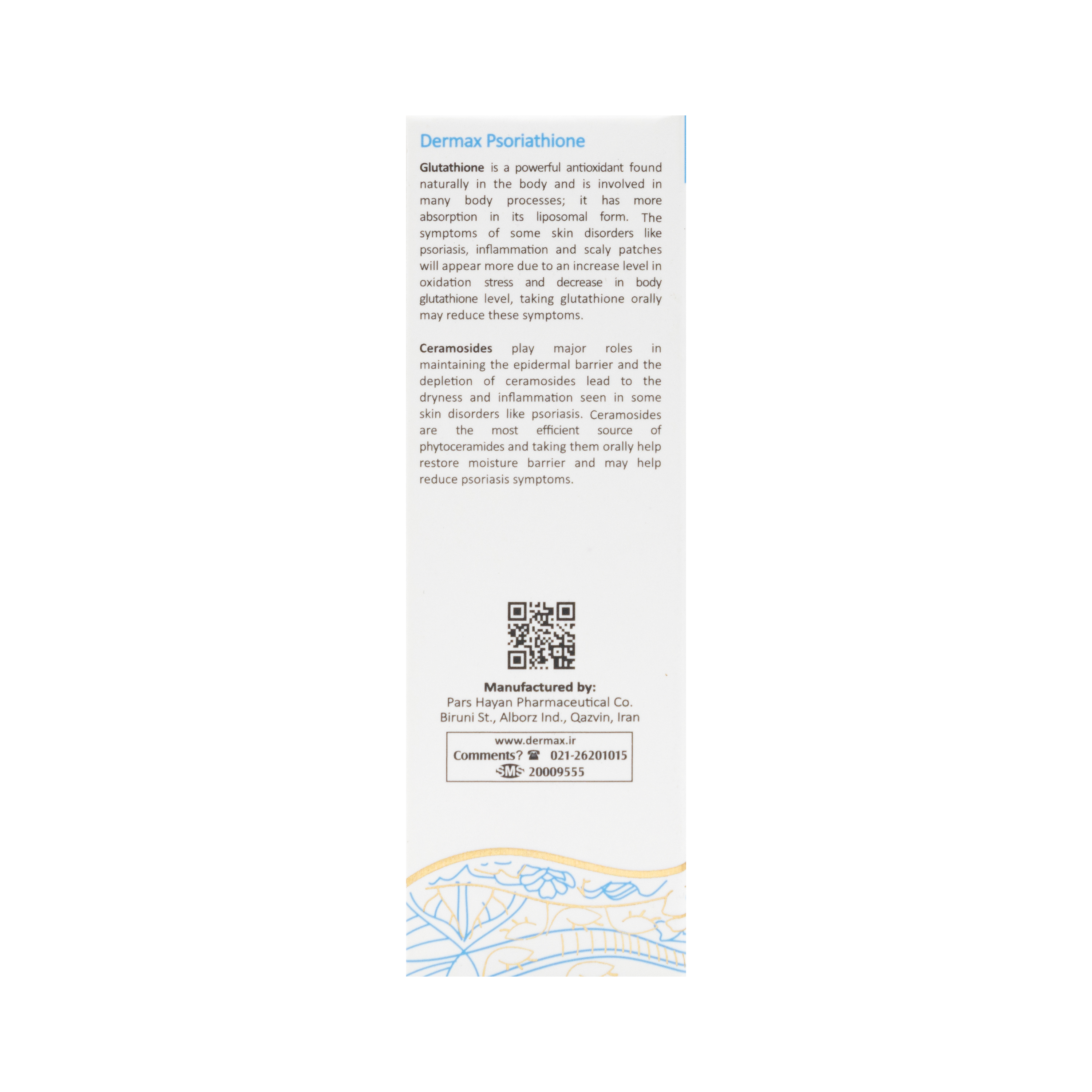 مکمل درمکس سوریاتیون ترکیب منحصر به فردی از دو ماده گلوتاتیون لیپوزومال و سراموزید میباشد که به تحریک سنتز سرامید در پوست کمک کرده و سبب حفظ رطوبت و سلامت سد دفاعی پوست میگردد. این مکمل همچنین از طریق کمک به هیدراته نمودن پوست و خواص ضد التهابی، سبب کمک به کاهش علائم پسوریازیس از قبیل التهاب، خارش و پوسته ریزی میگردد.