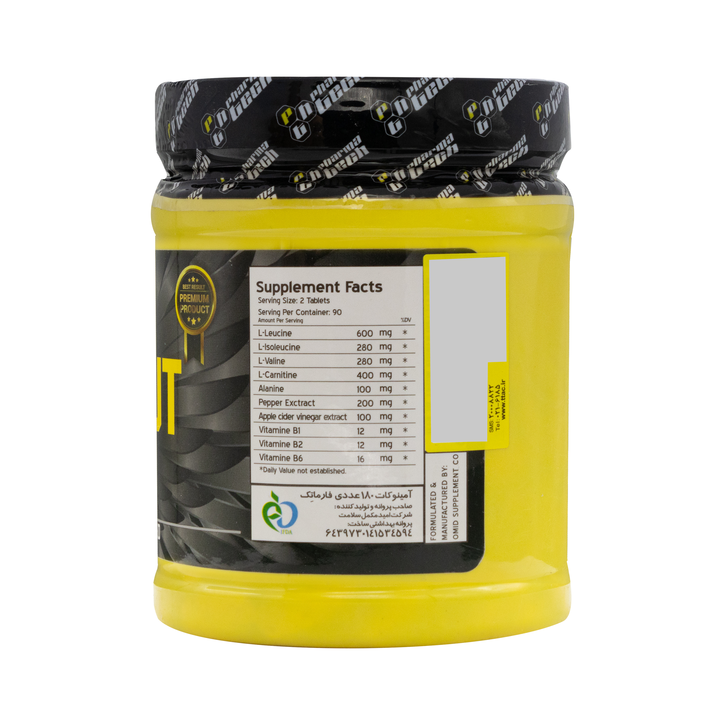 لوسین، ایزولوسین، والین، ال کارنیتین. آلانین، عصاره فلفل، عصاره سرکه سیب، ویتامین B1، ویتامین B2، ویتامین B6، اسید اسکوربیک، PVP، سلولز میکرو کریستالی، استئارات منیزیم، اسید سیتریک.