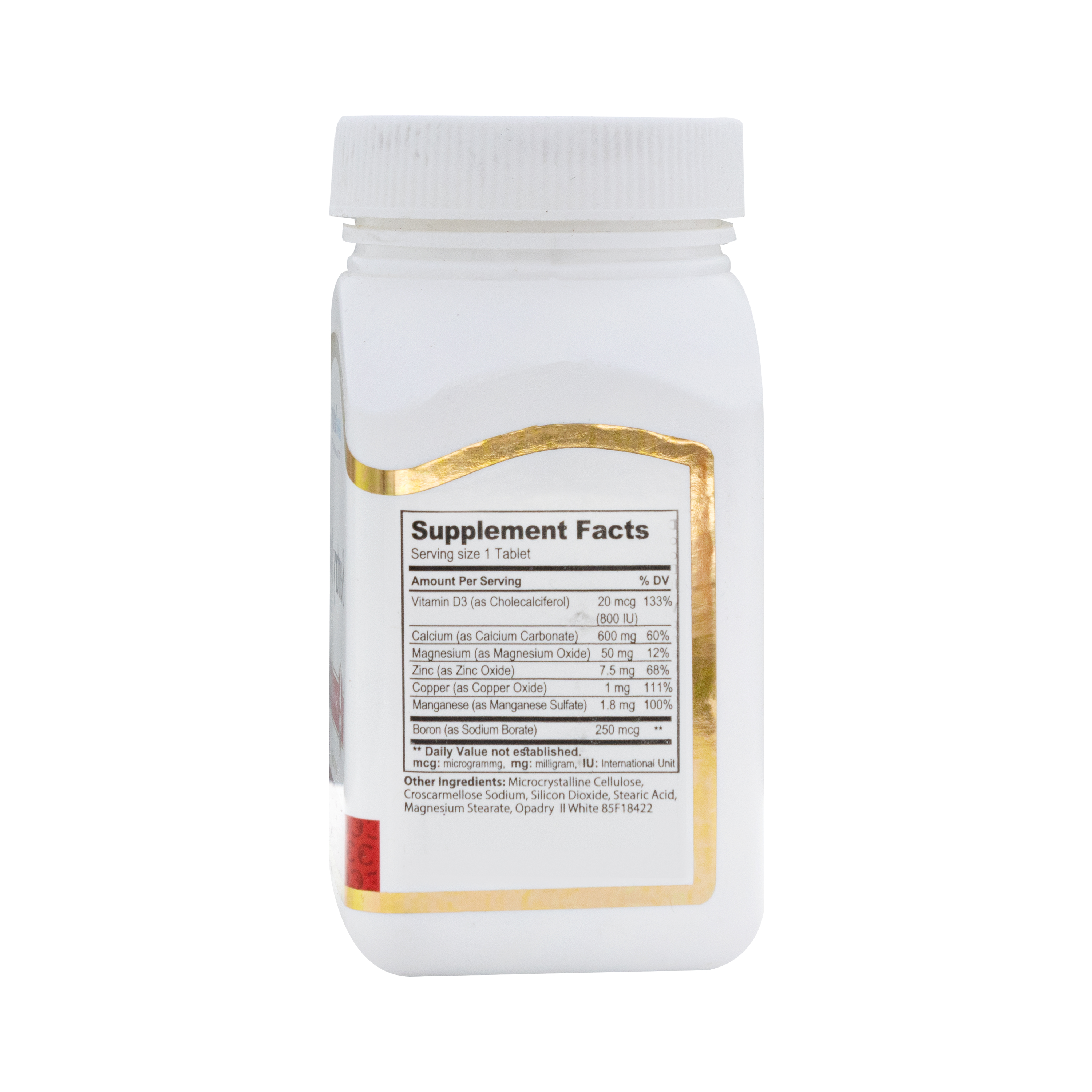 حاوی کلسیم به فرم کربنات، ویتامین D، منیزیم، زینک، منگنز، مس و بور