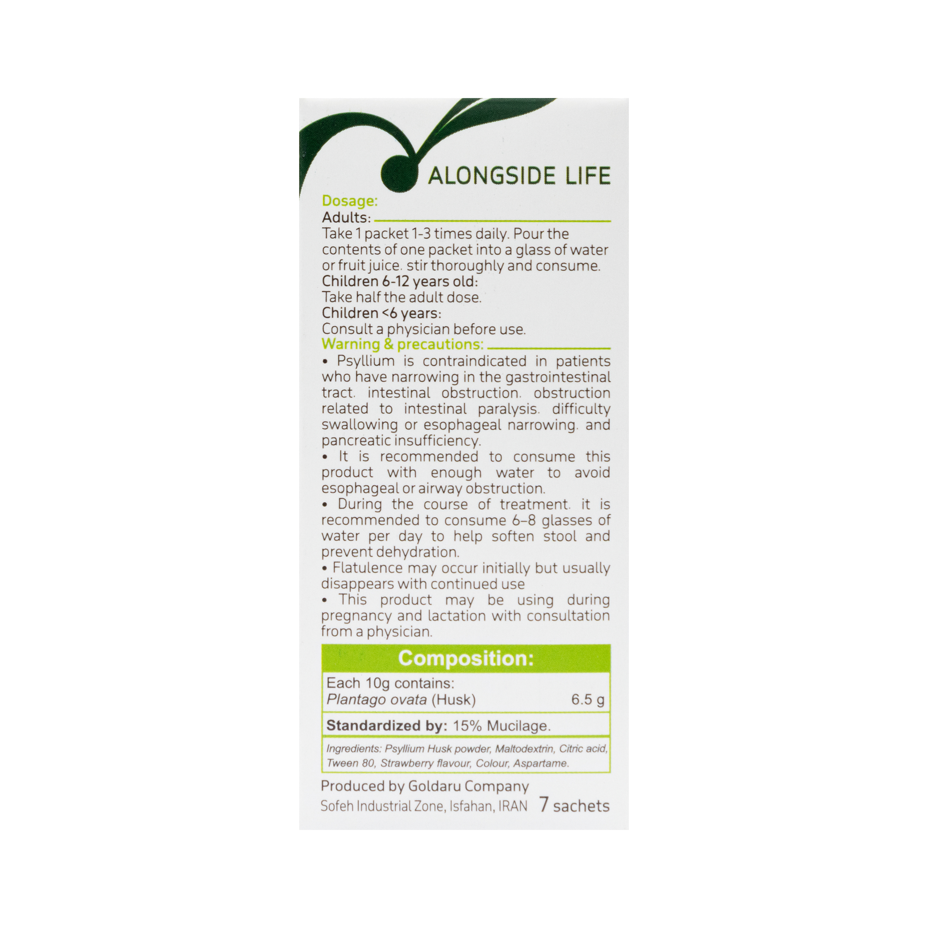پودر طبیعی ملین فیبری حاوی پوست دانه اسفرزه (Plantago ovata) به میزان 3/4 گرم در هر دوز می باشد.