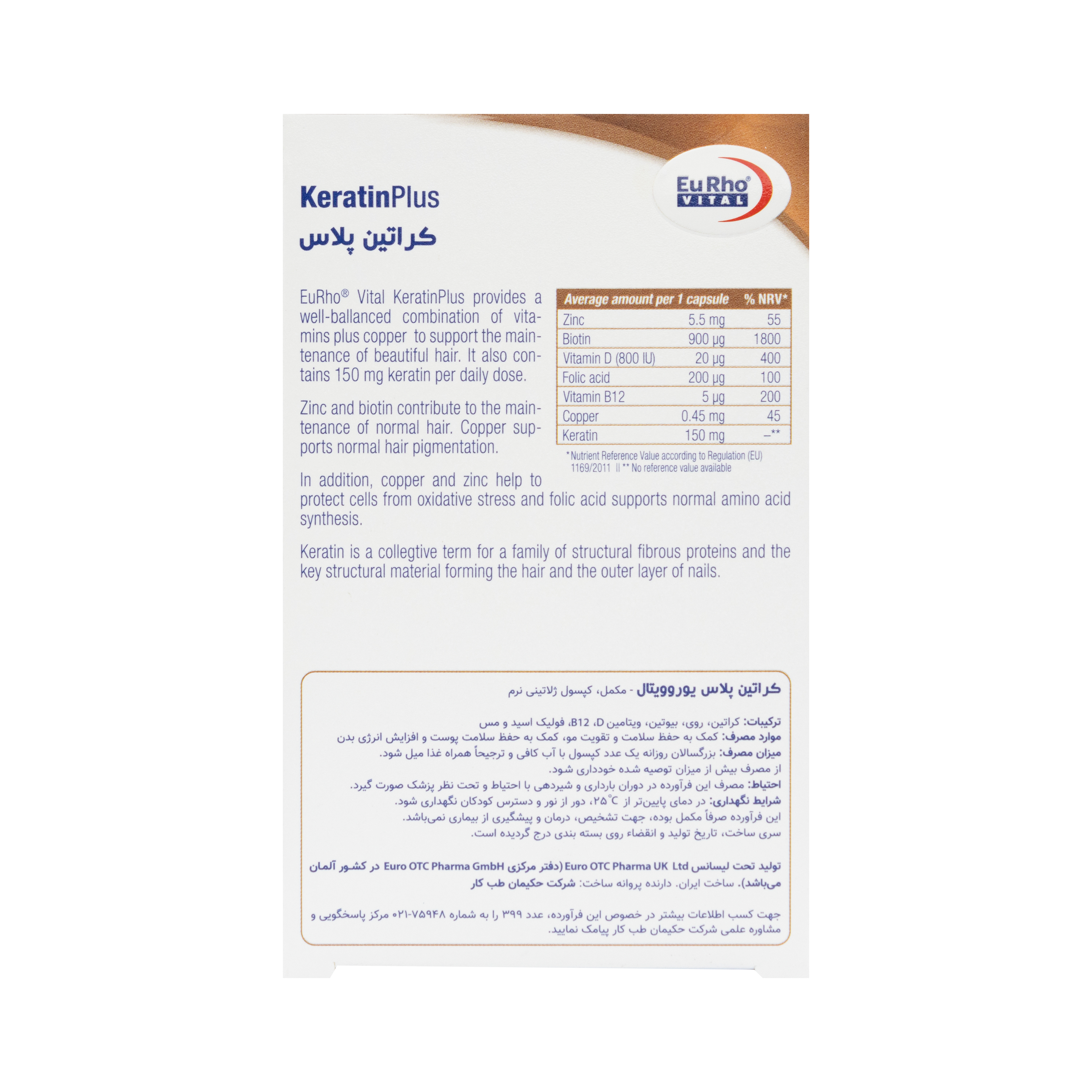کراتین پلاس یوروویتال ترکیبی متعادل از ویتامین ها به علاوه مس می باشد که در حفظ سلامت و زیبایی مو موثر است.