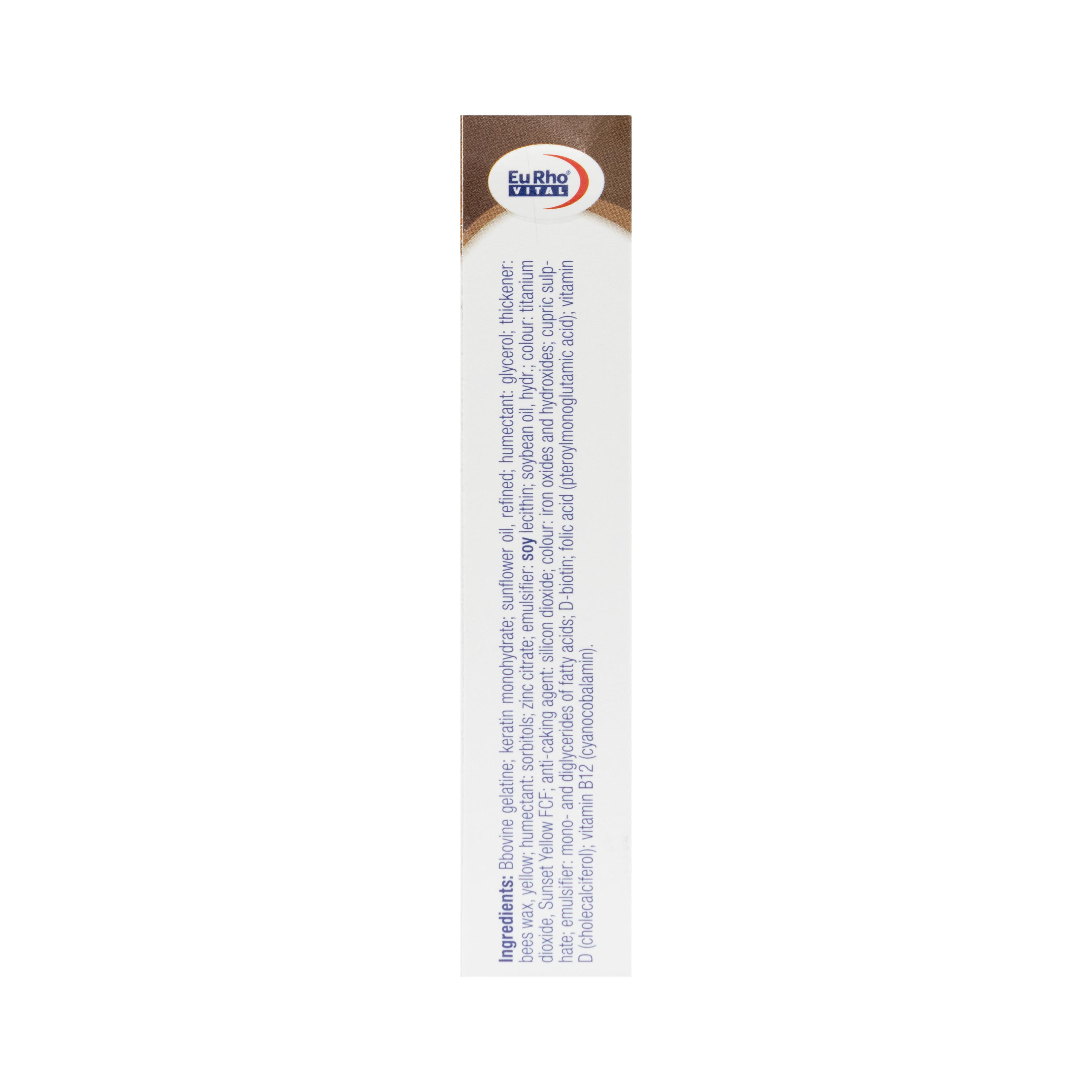 Ingredients: Bbovine gelatine; keratin monohydrate; sunflower oil, refined; humectant: glycerol; thickener: bees wax, yellow; humectant: sorbitols; zinc citrate; emulsifier: soy lecithin; soybean oil, hydr.; colour: titanium dioxide, Sunset Yellow FCF; anti-caking agent: silicon dioxide; colour: iron oxides and hydroxides; cupric sulp- hate; emulsifier: mono- and diglycerides of fatty acids; D-biotin; folic acid (pteroylmonoglutamic acid); vitamin D (cholecalciferol); vitamin B12 (cyanocobalamin)