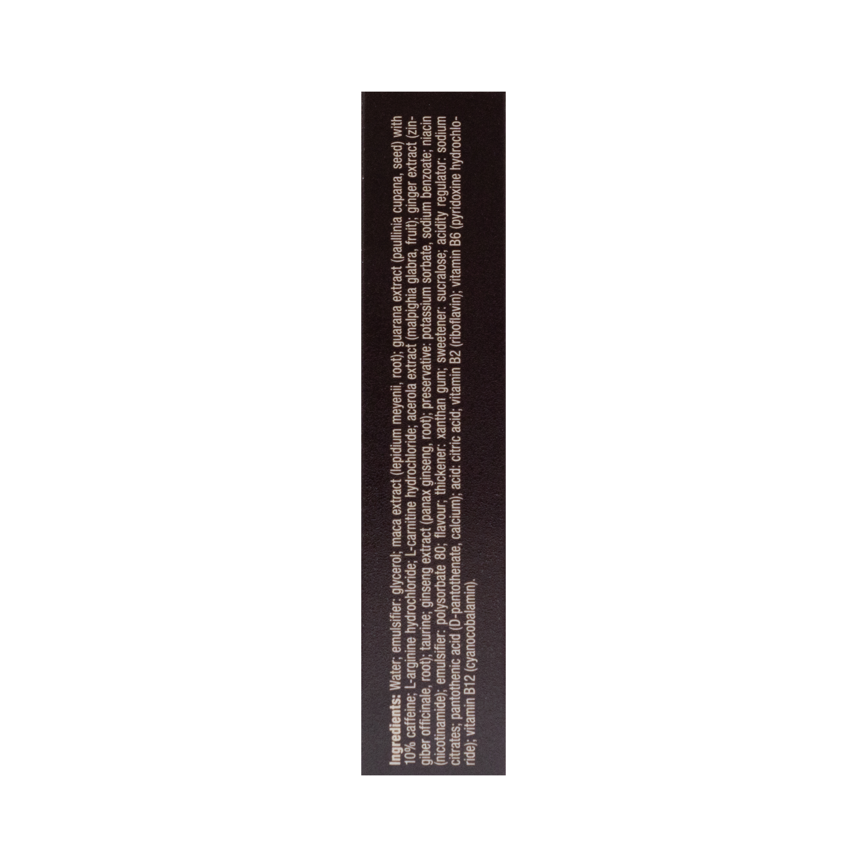 Ingredients: Water; emulsifier: glycerol; maca extract (lepidium meyenii, root); guarana extract (paullinia cupana, seed) with 10% caffeine; L-arginine hydrochloride; L-carnitine hydrochloride; acerola extract (malpighia glabra, fruit); ginger extract (zin- giber officinale, root); taurine; ginseng extract (panax ginseng, root); preservative: potassium sorbate, sodium benzoate; niacin (nicotinamide); emulsifier: polysorbate 80; flavour; thickener: xanthan gum; sweetener: sucralose; acidity regulator: sodium citrates; pantothenic acid (D-pantothenate, calcium); acid: citric acid; vitamin B2 (riboflavin); vitamin B6 (pyridoxine hydrochlo- ride); vitamin B12 (cyanocobalamin)