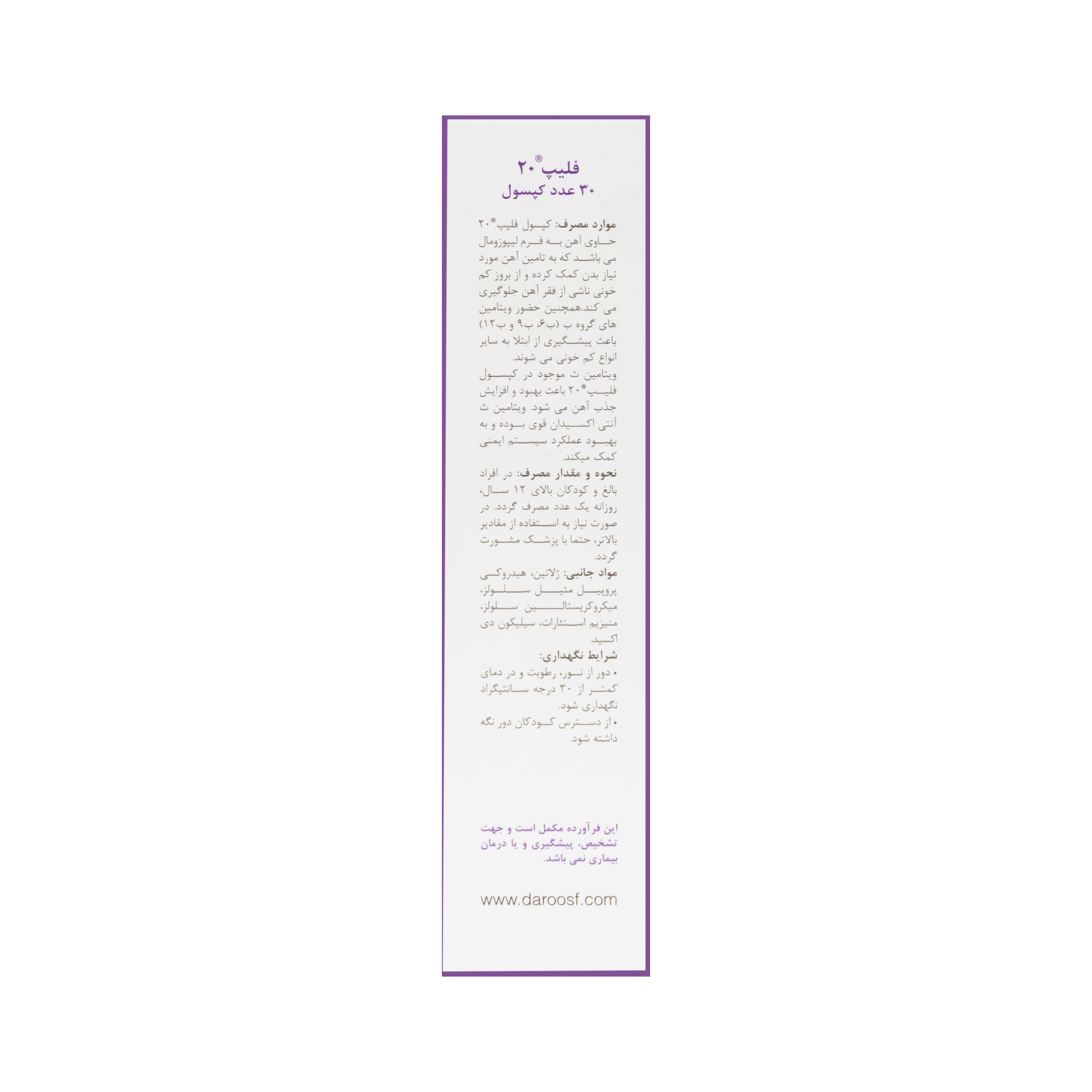 - کپسول فلیپ 20 حاوی 20 میلیگرم آهن لیپوزومال به همراه فولیک اسید به علاوه ویتامینهای سی، ب6 و ب12 میباشد.