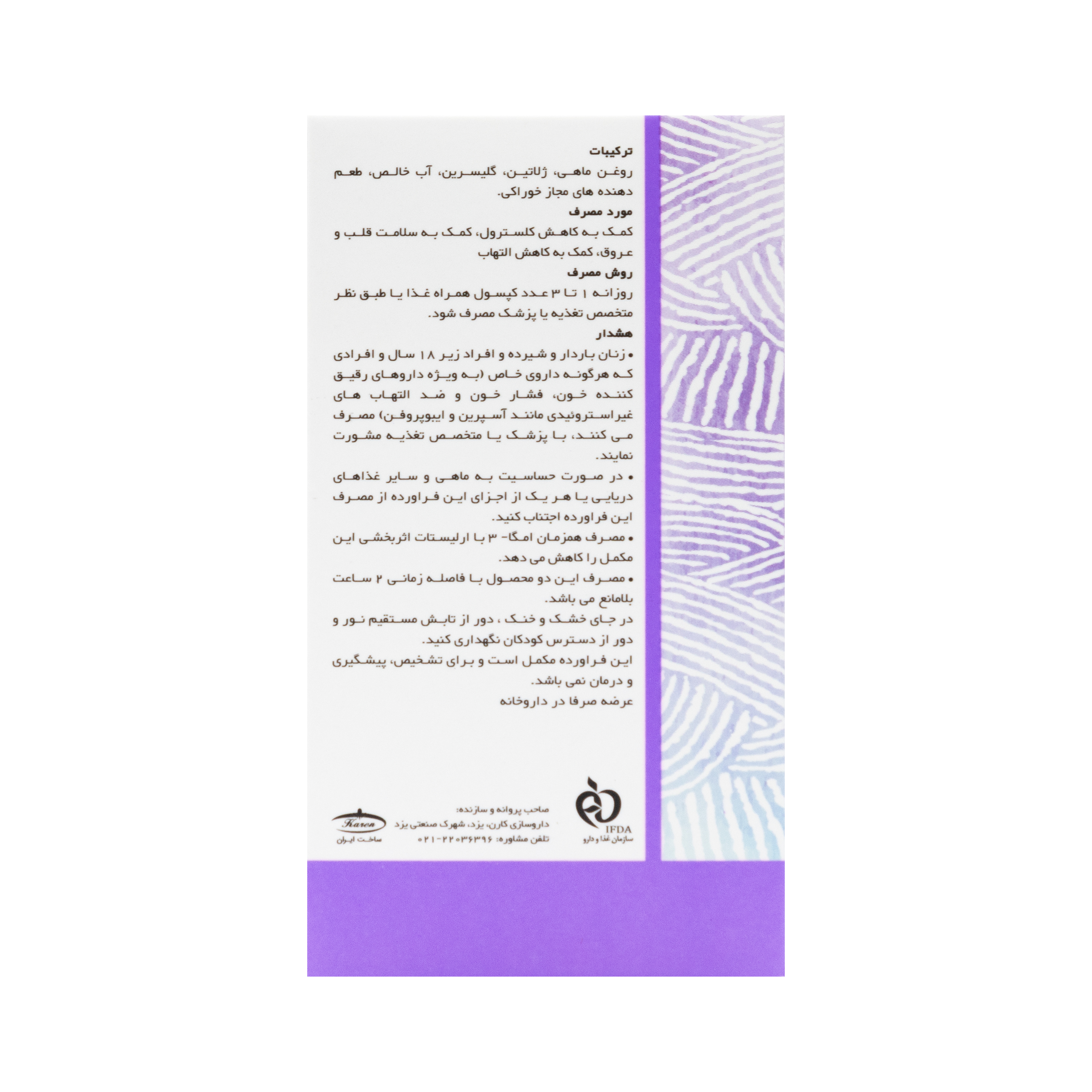 - حاوی 1000 میلی گرم روغن ماهی، 500 میلی گرم ای پی ای(EPA) و 200 میلی گرم دی اچ ای(DHA)
