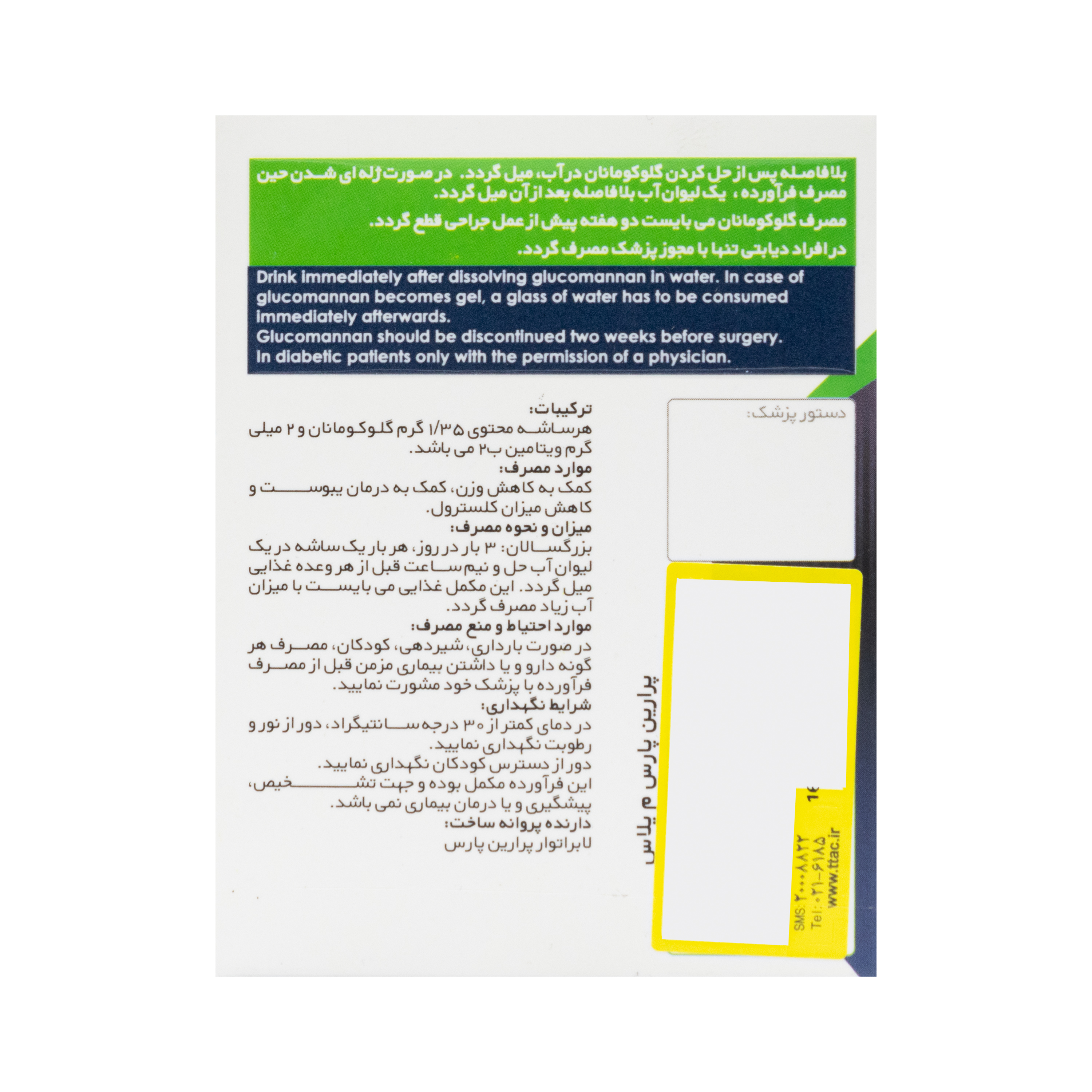 - 1.35 گرم گلوکومانان و 2 میلی گرم ویتامین B2