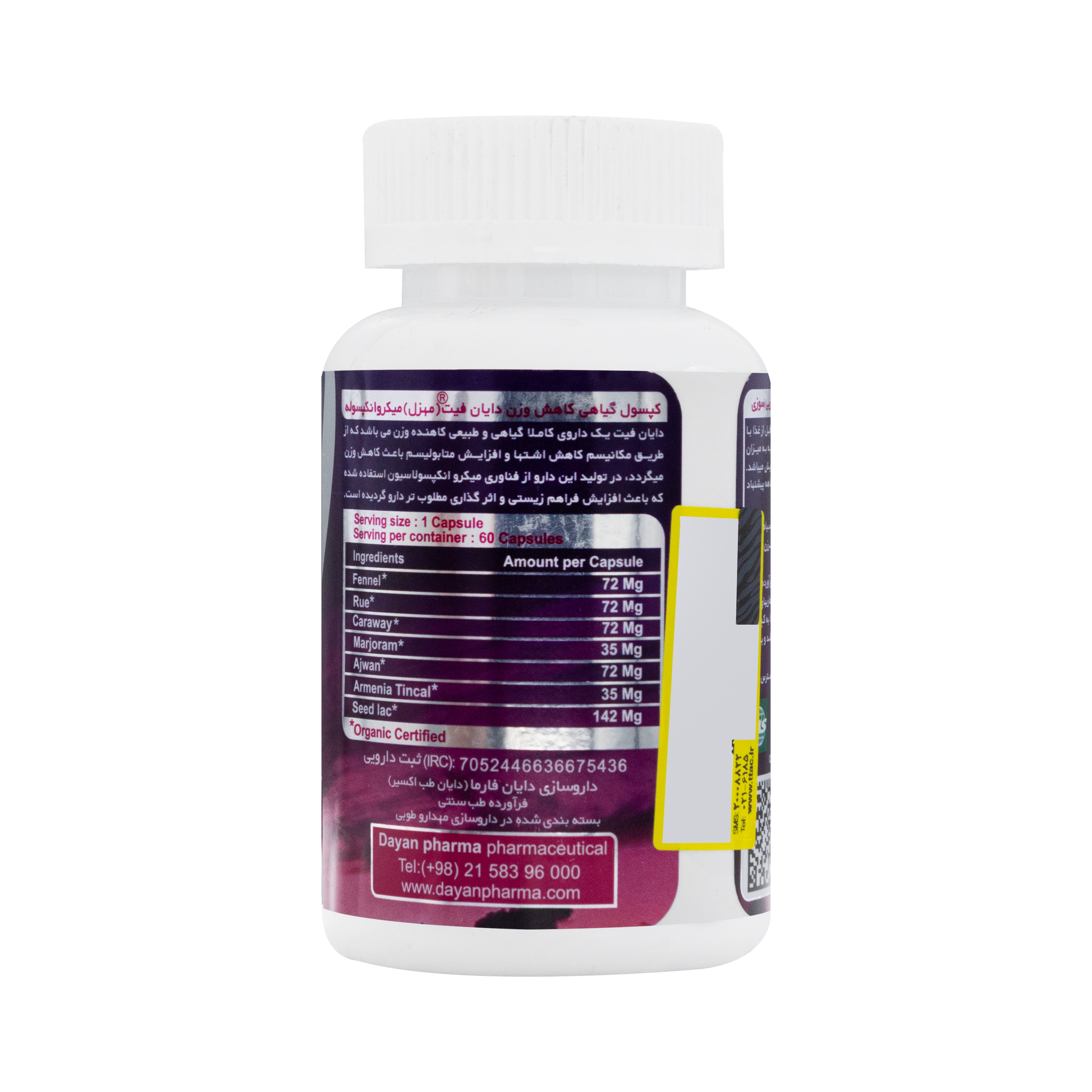دایان فیت، یک مکمل کاملاً گیاهی است که با استفاده از فناوری میکرو انکپسولاسیون تولید شده است. این فناوری باعث افزایش فراهم زیستی و اثرگذاری بهتر ترکیبات گیاهی موجود در کپسول میشود. این محصول با دارا بودن ترکیباتی مانند زیره، زنیان، مرزنجوش و سداب، به عنوان یک چربی سوز طبیعی عمل کرده و به کاهش وزن کمک میکند.