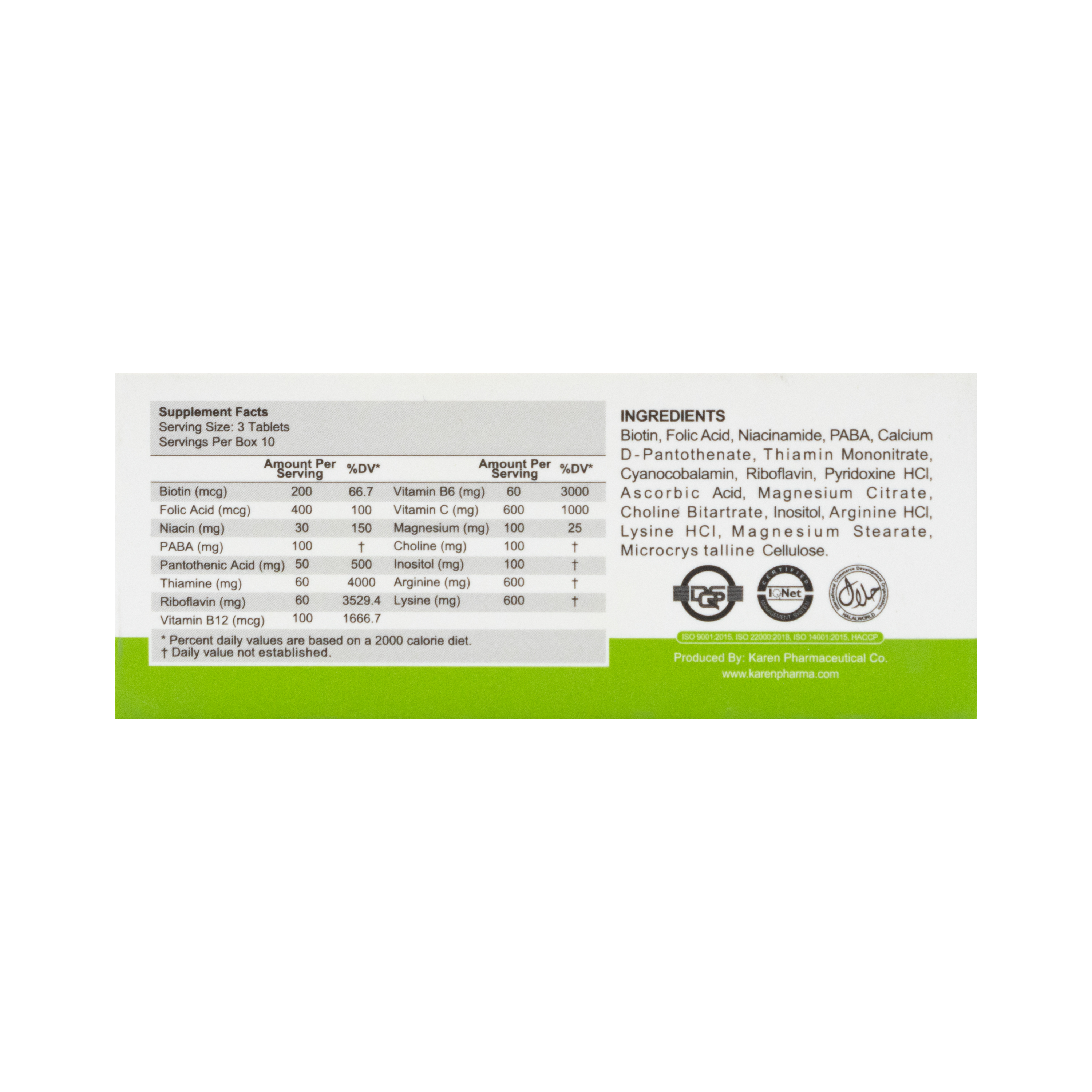 INGREDIENTS: Biotin, Folic Acid, Niacinamide, PABA, Calcium D-Pantothenate, Thiamin Mononitrate, Cyanocobalamin, Riboflavin, Pyridoxine HCI, Ascorbic Acid, Magnesium Citrate, Choline Bitartrate, Inositol, Arginine HCI, Lysine HCI, Magnesium Stearate, Microcrys talline Cellulose