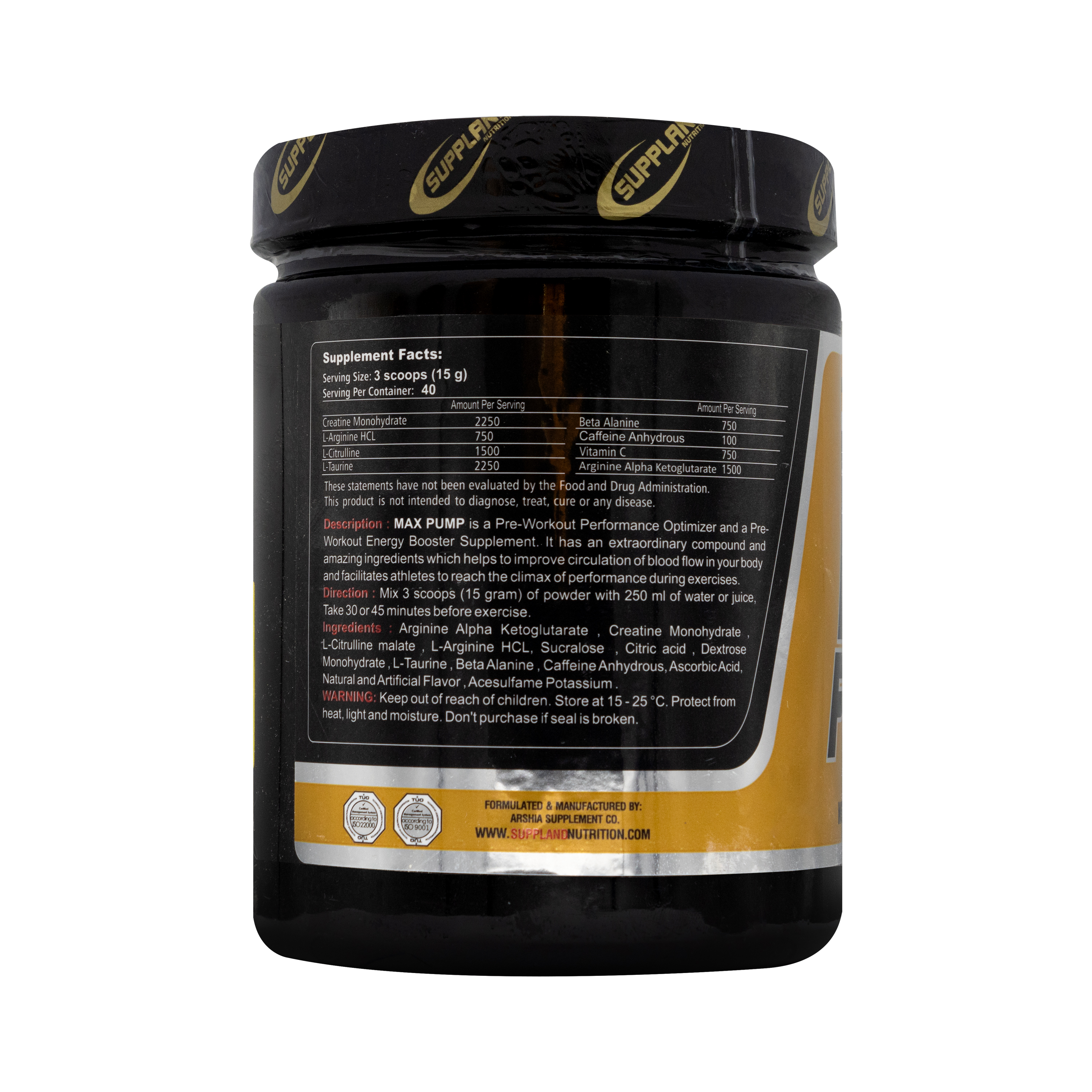 سه پیمانه (15 گرم) مکس پمپ را با 250 میلی لیتر آب سرد مخلوط نموده، 30 تا 45 دقیقه قبل از شروع ورزش مصرف نمایید.