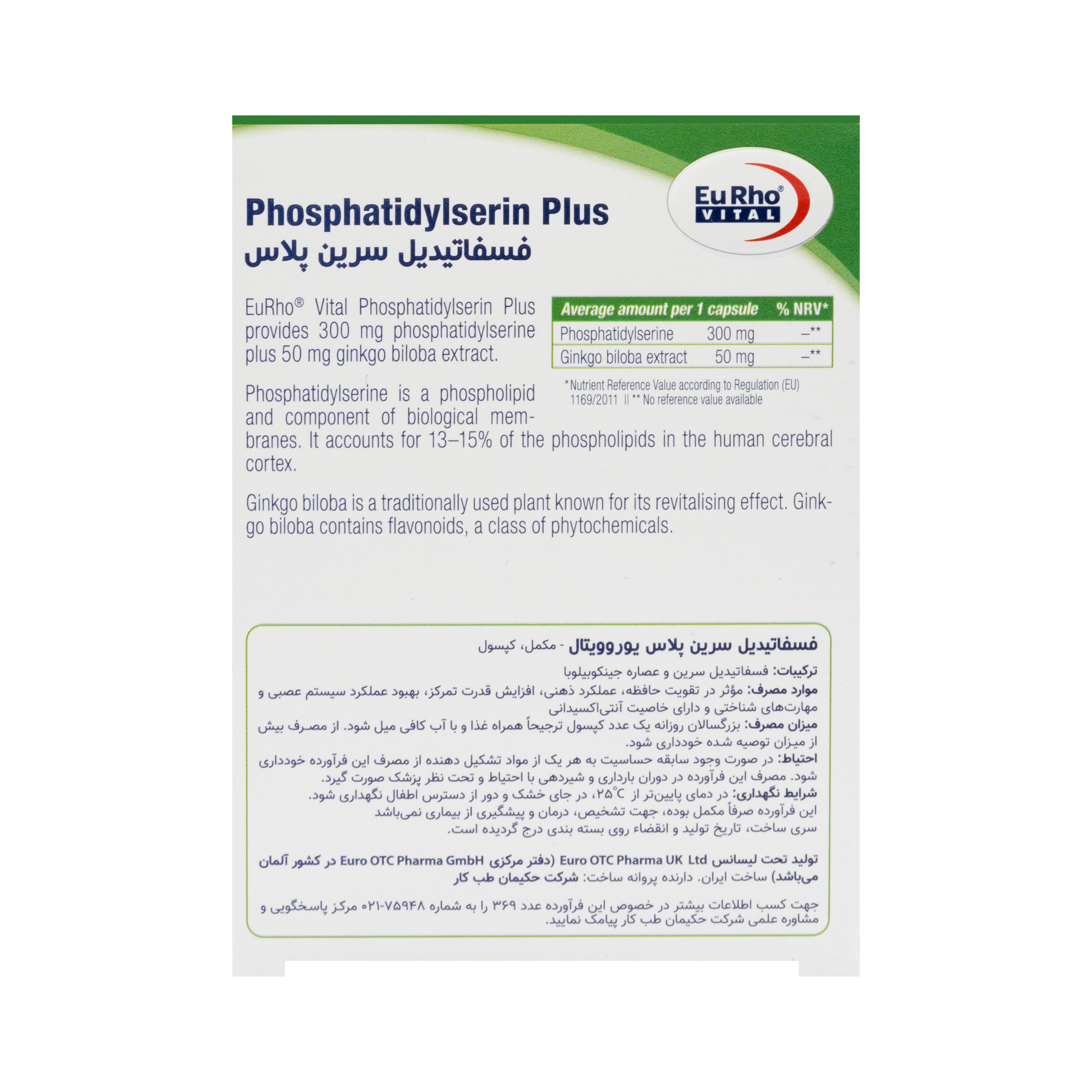 کپسول فسفاتیدیل سرین پلاس یوروویتال، محصولی تحت لیسانس Euro OTC Pharma UK Ltd در کشور آلمان است که در ایران توسط شرکت حکیمان طب کار تولید و بستهبندی میشود. این مکمل با فرمولاسیون ویژه خود، به تقویت عملکرد ذهنی، بهبود خلق و خو، حافظه، تمرکز و یادگیری کمک میکند.