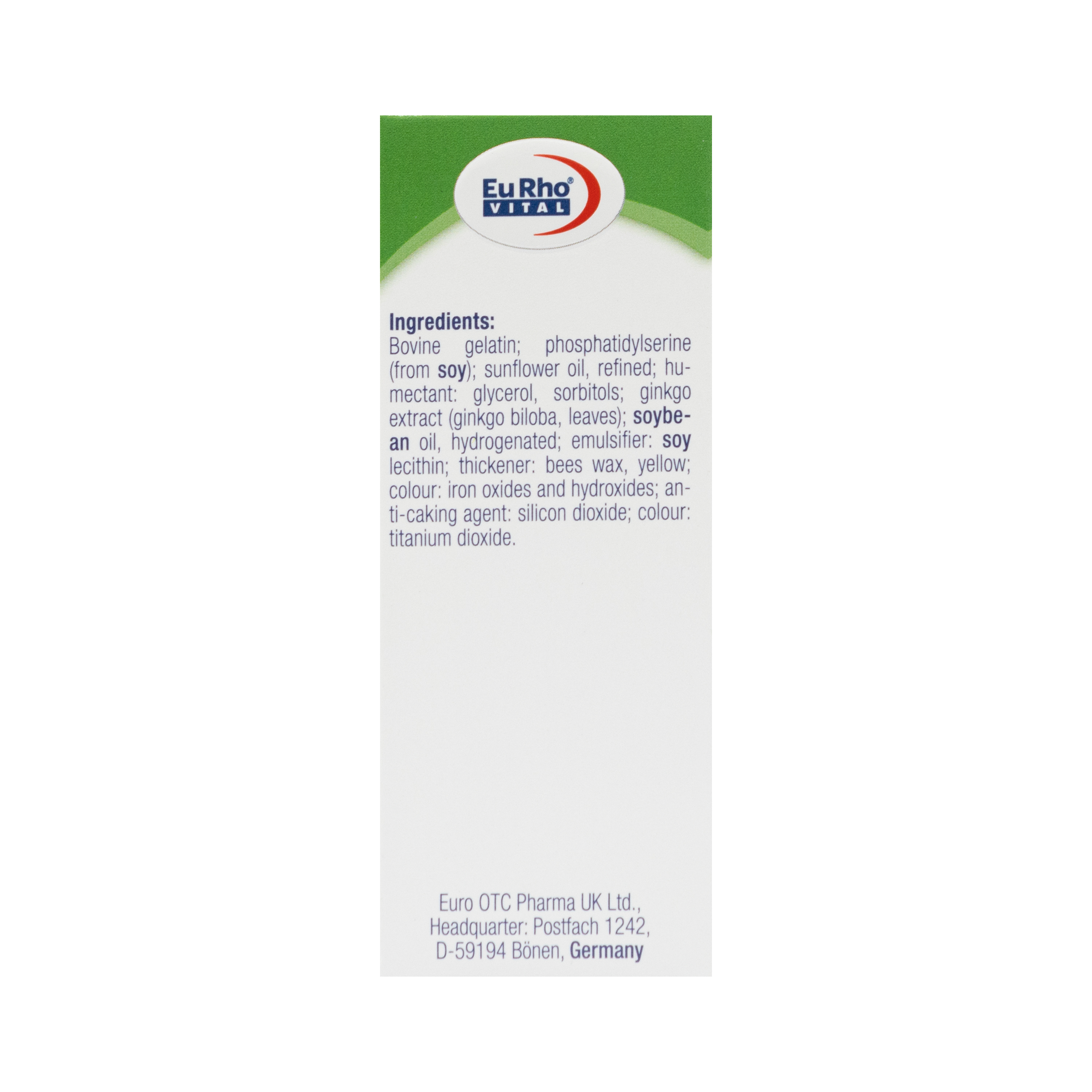 Ingredients: Bovine gelatin; phosphatidylserine (from soy); sunflower oil, refined; hu- mectant: glycerol, sorbitols; ginkgo extract (ginkgo biloba, leaves); soybean oil, hydrogenated; emulsifier: soy lecithin; thickener: bees wax, yellow; colour: iron oxides and hydroxides; an- ti-caking agent: silicon dioxide; colour: titanium dioxide