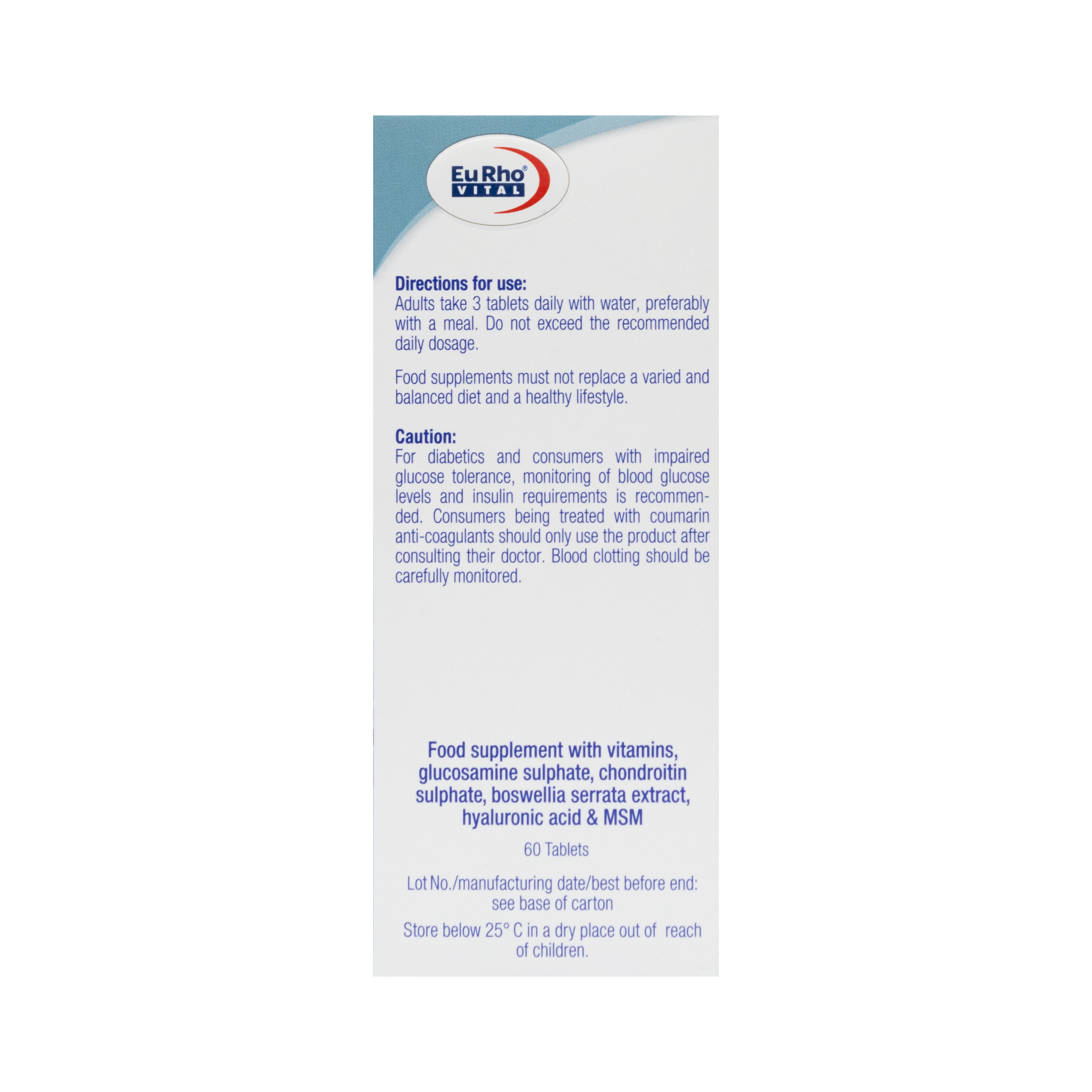 Ingredients: Glucosamine sulphate potassium chloride; chondroitin sulphate; bulking agent: calcium phosphate; methylsufonylmethane; boswellia serrata extract; bulking agent: micro- crystalline cellulose, polyvinylpyrrolidone; anti- caking agent: silicon dioxide, magnesium salts of fatty acids; vitamin C (L-ascorbic acid); sodi- um hyaluronate; bulking agent: corn starch; bulking agent: sodium carboxy methyl cellulose; vitamin D (cholecalciferol)