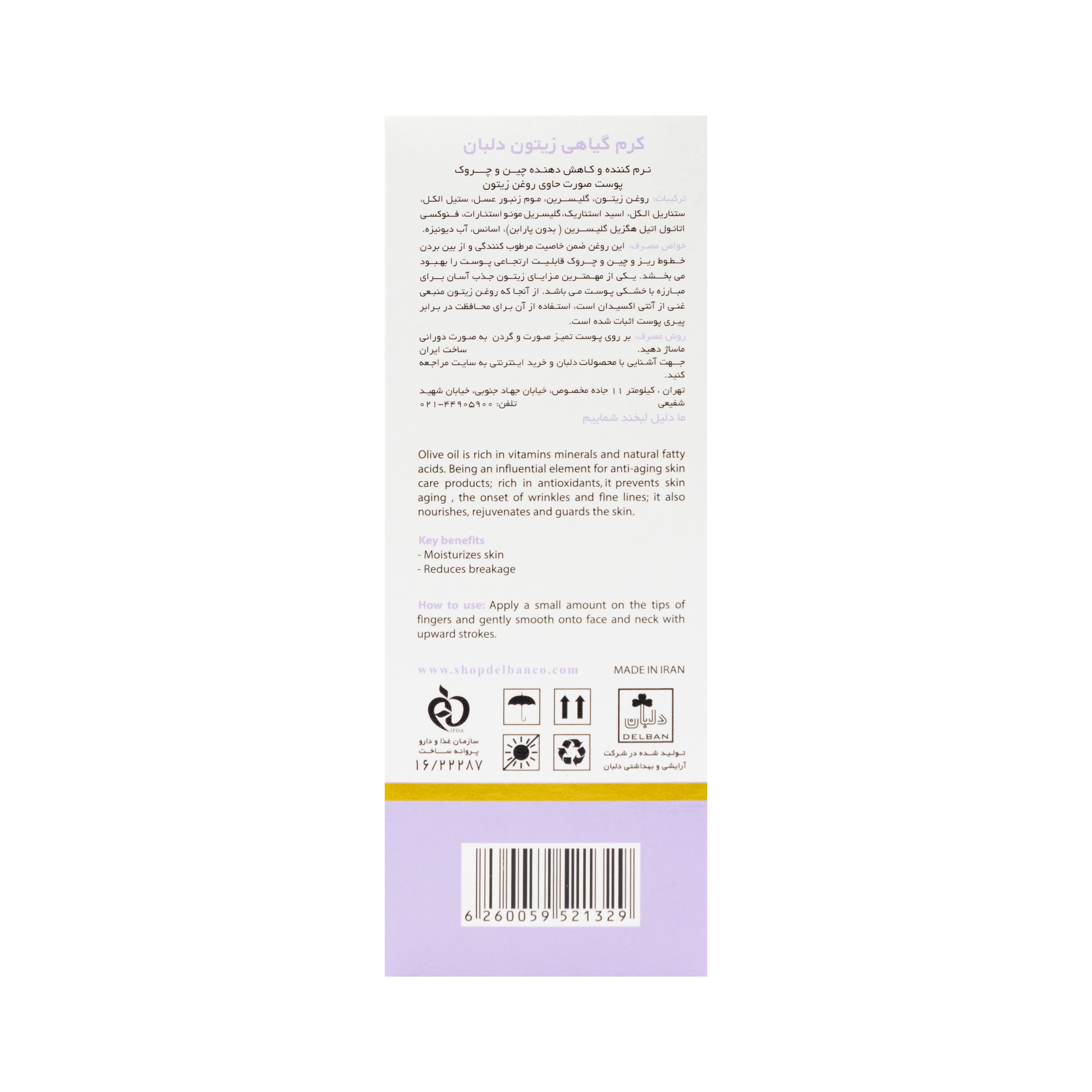کرم گیاهی زیتون دلبان سرشار از روغن زیتون تصفیه شده بوده که با خاصیت جذب بالای روغن بر روی پوست موجب نرم شدن و کاهش عمق چین و چروک آن می گردد.