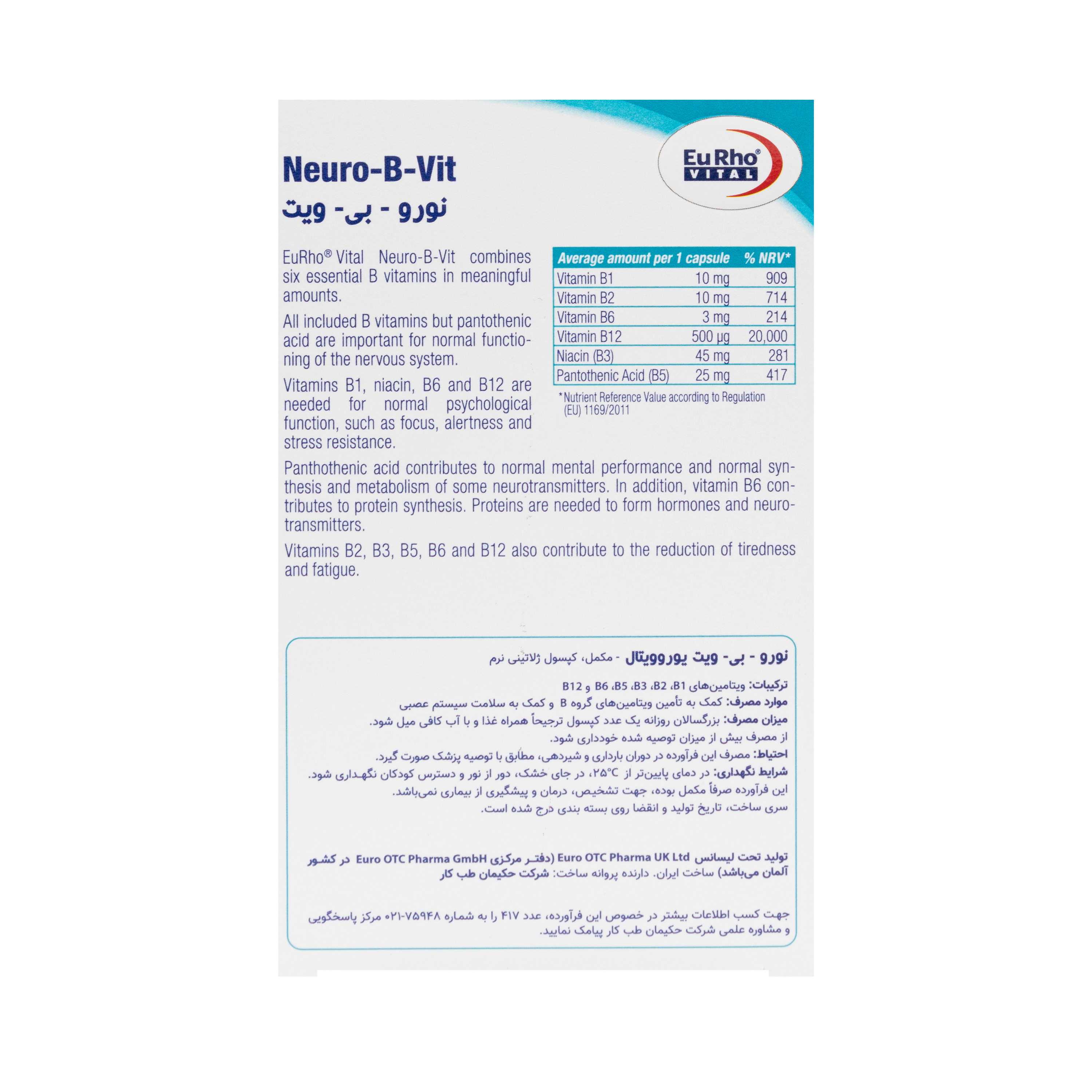 کپسول نورو بی ویت یوروویتال یک مکمل غذایی است که حاوی ویتامینهای گروه B میباشد. این ویتامینها برای عملکرد صحیح سیستم عصبی ضروری هستند. نورو بی ویت یوروویتال در ایران تحت لیسانس شرکت یورو او تی سی فارما کشور آلمان تولید میشود. این شرکت سالهاست که در زمینه تولید مکملهای غذایی فعالیت میکند و رضایتمندی اکثریت مصرفکنندگان خود را کسب کرده است.