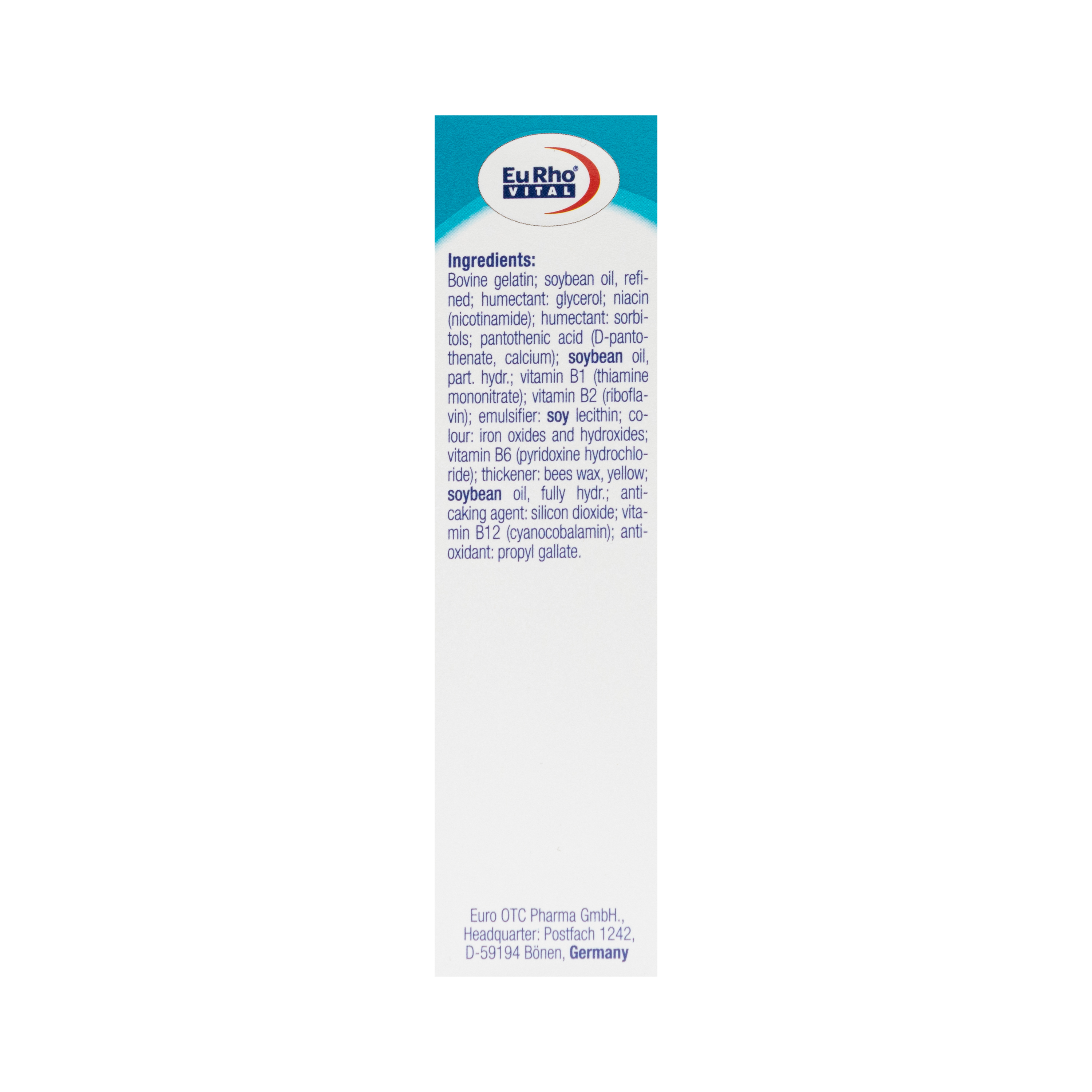 Ingredients: Bovine gelatin; soybean oil, refi- ned; humectant: glycerol; niacin (nicotinamide); humectant: sorbi- tols; pantothenic acid (D-panto- thenate, calcium); soybean oil, part. hydr.; vitamin B1 (thiamine mononitrate); vitamin B2 (ribofla- vin); emulsifier: soy lecithin; co- lour: iron oxides and hydroxides; vitamin B6 (pyridoxine hydrochlo- ride); thickener: bees wax, yellow; soybean oil, fully hydr.; anti- caking agent: silicon dioxide; vita- min B12 (cyanocobalamin); anti- oxidant: propyl gallate