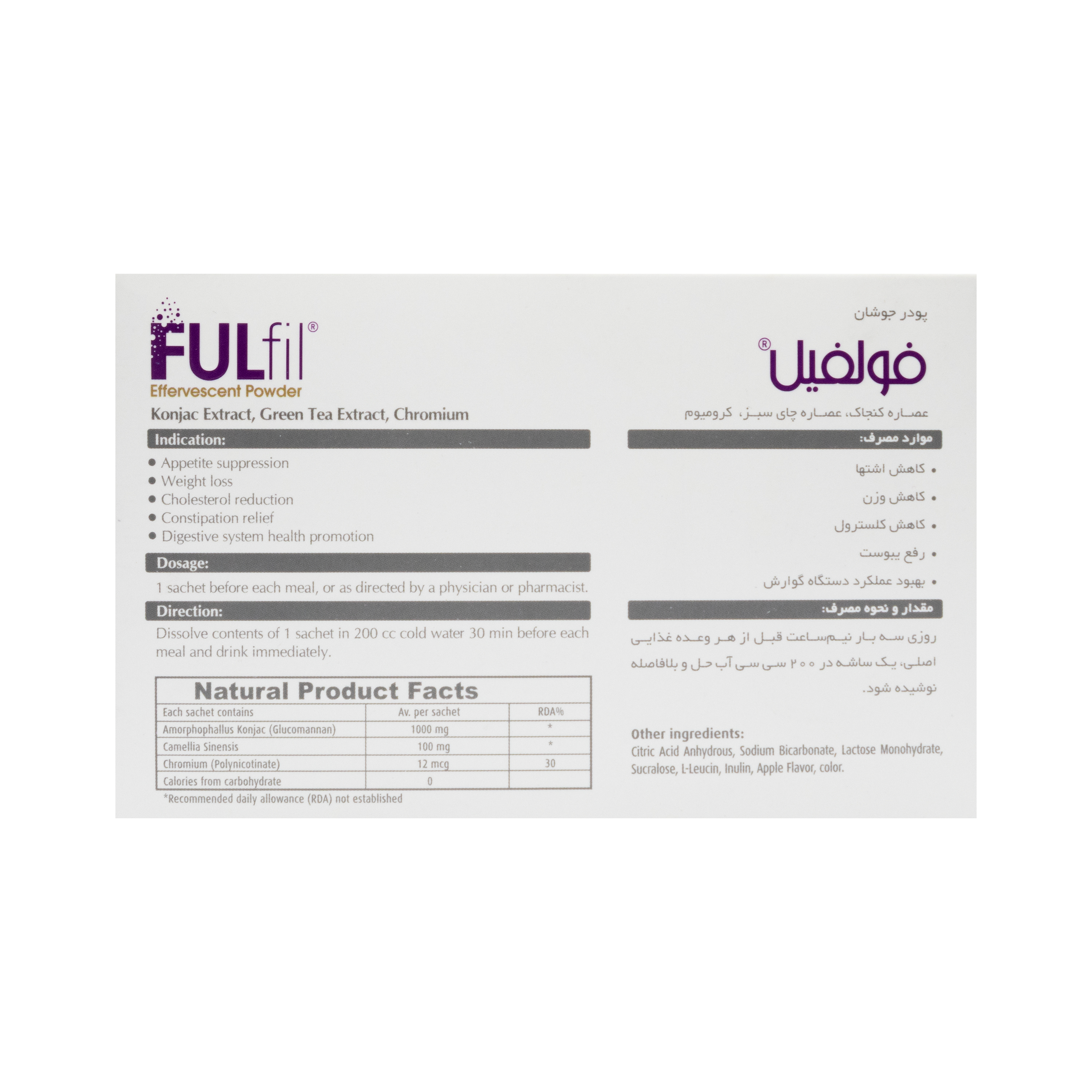 فولفیل پودر جوشان منحصر به فرد و خوش طعم برای کاهش اشتها و کاهش وزن می باشد. در اغلب موارد علت عدم موفقیت در پیروی از رژیم های کاهش وزن، گرسنگی و ضعف ناشی از کاهش کالری دریافتی می باشد. محتویات این فرآورده شامل گلوکومانان یا فیبر محلول تهیه شده از گیاه کنجاک Amorphophallus) Konaco) عصـاره چای سبز (Camellia sinensis) و کرومیوم است که با کاهش موثر اشتها افزایش کاتابولیسم چربی ها، رفع یبوست و کاهش کلسترول، به شما در دستیابی به کاهش وزنی چشم گیر و بدون عوارض جانبی در کنار رعایت برنامه غذایی و فعالیت بدنی مناسب یاری می رساند.