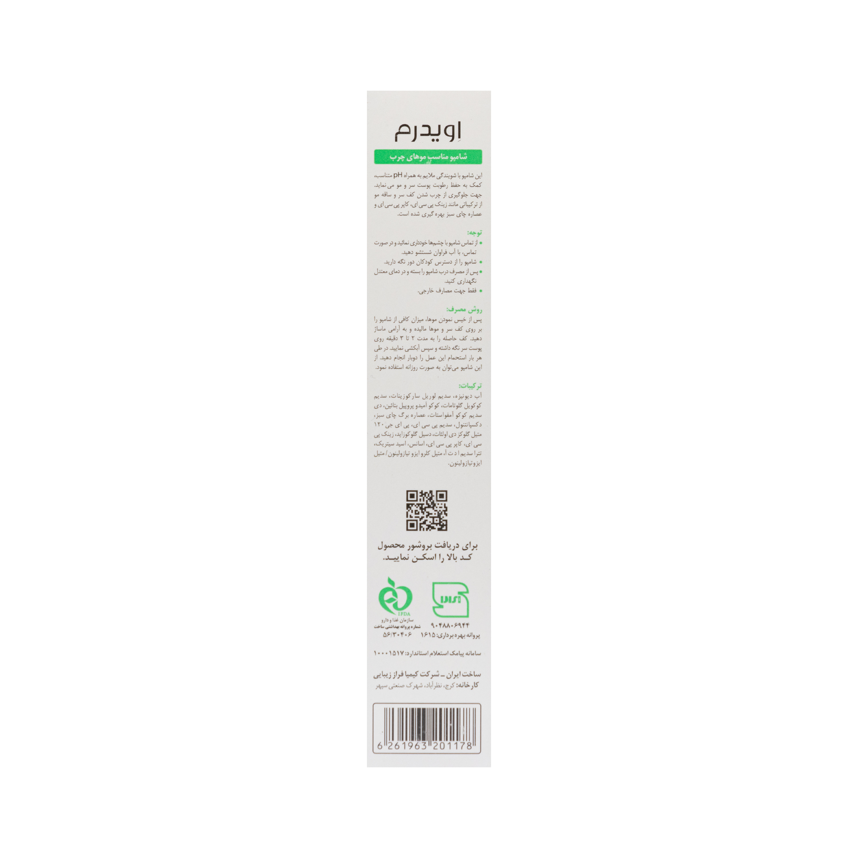 شامپو بدون سولفات موی چرب اویدرم با تنظیم pH پوست سر و مو سبب حفظ رطوبت ساقه مو شده و از تحریک پوست سر جلوگیری می کند. ترکیبات موثره این شامپو (زینک پی سی ای، کاپر پی سی ای و عصاره چای سبز) میزان چربی پوست سر را کنترل نموده و مانع از چرب شدن بیش از حد ساقه مو می شود.