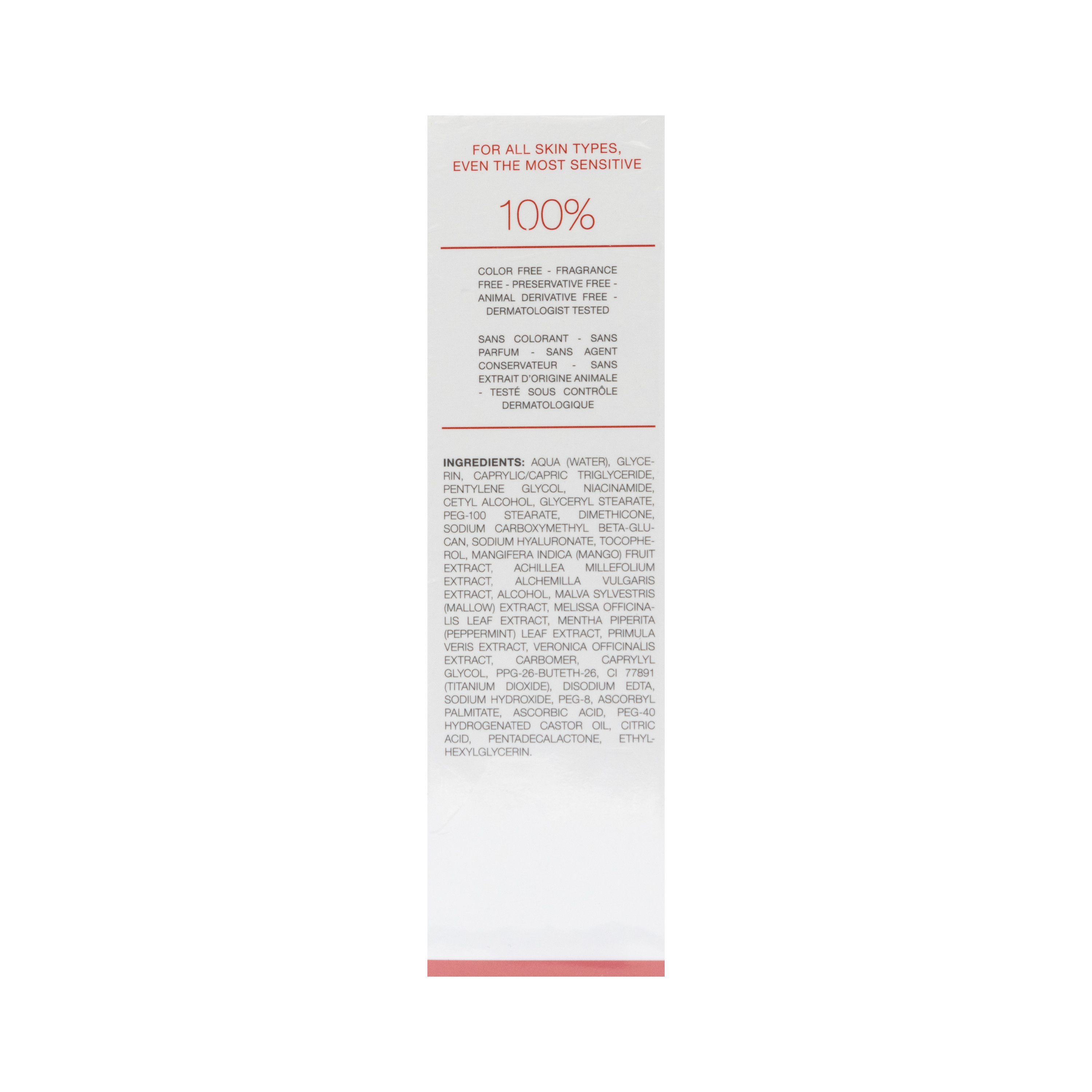 - آب، گلیسرین، کاپریلیک/ کاپریک تری گلیسرید، پنتیلن گلایکول، نیاسین آمید، ستیل الکل، گلیسریل استئارات، PEG-100 استئارات، دایمتیکون، سدیم کربوکسی متیل بتاگلوکان، سدیم هیالورونات، توکوفرول، عصاره میوه انبه، عصاره بومادران، الکل، عصاره پنیرک، عصاره بادرنجبویه، عصاره نعناع فلفلی، عصاره پامچال، عصاره ورونیکا، کربومر، کاپریلیل گلایکول، 26-بوتث PPG-26-، CI 77891 (تیتانیوم دی اکساید)، دی سدیم EDTA، سدیم هیدروکساید، PEG-8 آسکوربیل پالمیتات، آسکوربیک اسید، PEG-40 هیدروژنیتد کاستر اویل، سیتریک اسید، پنتادکالاکتون، اتیل هگزیل گلیسرین.