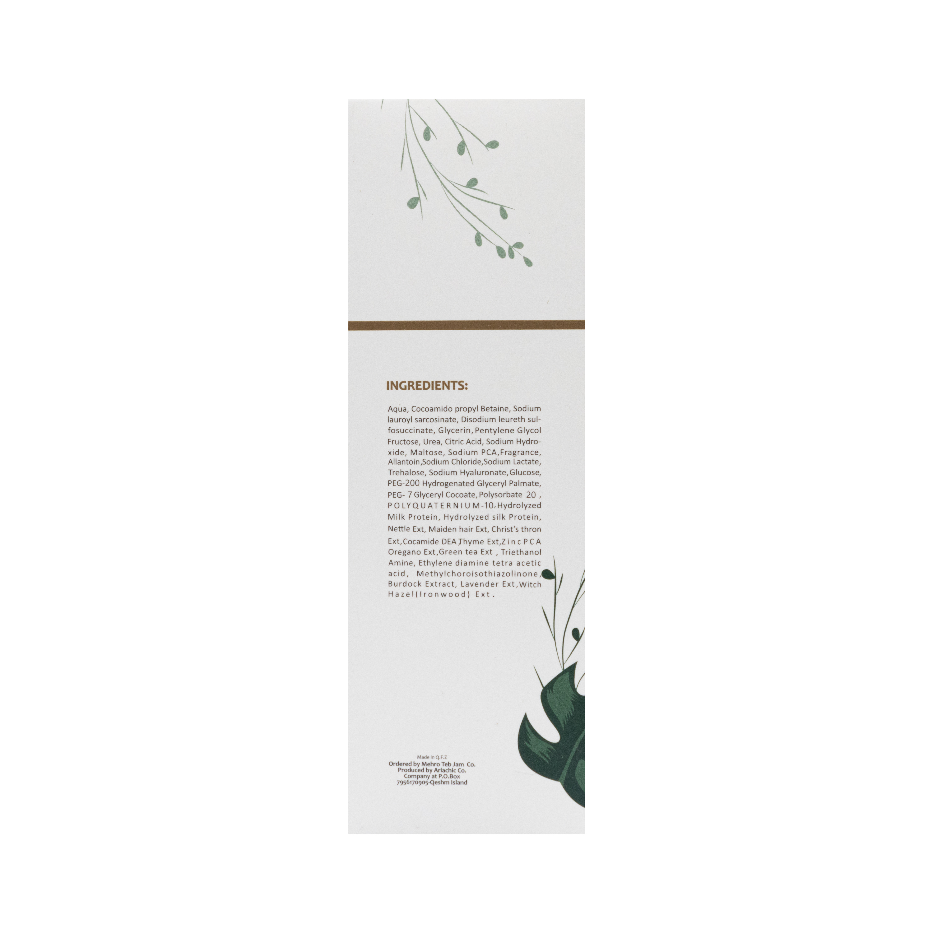 INGREDIENTS: Aqua, Cocoamido propyl Betaine, Sodium lauroyl sarcosinate, Disodium leureth sul- fosuccinate, Glycerin, Pentylene Glycol Fructose, Urea, Citric Acid, Sodium Hydro- xide, Maltose, Sodium PCA, Fragrance, Allantoin,Sodium Chloride, Sodium Lactate, Trehalose, Sodium Hyaluronate, Glucose, PEG-200 Hydrogenated Glyceryl Palmate, PEG-7 Glyceryl Cocoate, Polysorbate 20, POLYQUATERNIUM-10, Hydrolyzed Milk Protein, Hydrolyzed silk Protein, Nettle Ext, Maiden hair Ext, Christ's thron Ext, Cocamide DEA Thyme Ext, Zinc PCA Oregano Ext, Green tea Ext, Triethanol Amine, Ethylene diamine tetra acetic acid, Methylchoroisothiazolinone, Burdock Extract, Lavender Ext, Witch Hazel (Ironwood) Ext