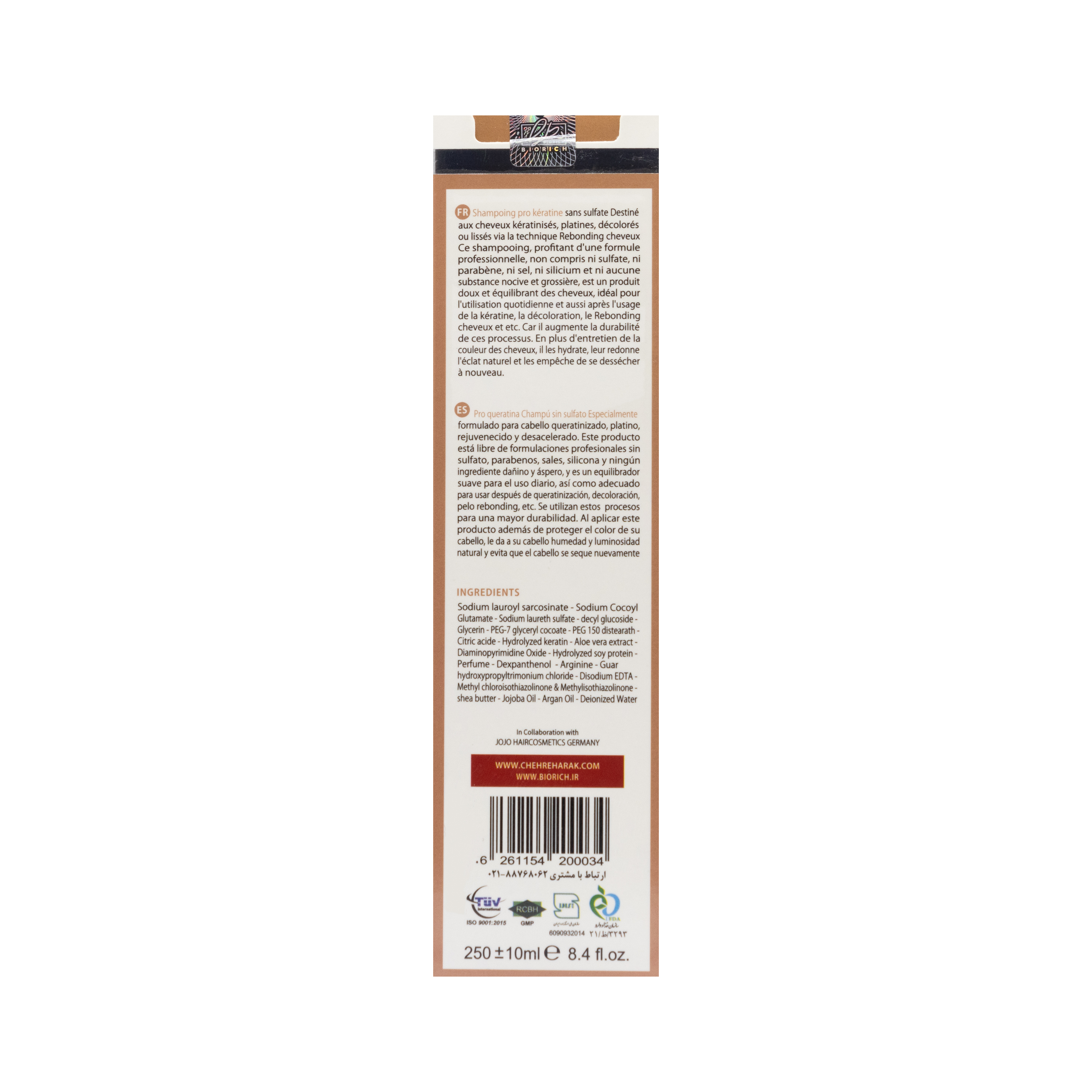 مخصوص موهای کراتینه، پلاتینه، ریباندینگ و دکلره شده این محصول با فرمولاسیونی حرفه ای فاقد ،سولفات، پارابن ،نمک سیلیکون و هرگونه مواد مضر و خشن بوده و متعادل کننده ملایم جهت استفاده روزانه و همچنین مناسب برای استفاده بعد از انجام کراتینه، دکلره ریباندینگ موها و غیره بوده که برای دوام بیشتر این فرایندها استفاده می شود. استفاده از این محصول علاوه بر محافظت از حفظ رنگ مو به موهای شما رطوبت و درخشندگی طبیعی داده و از خشک شدن مجدد موها جلوگیری می کند.