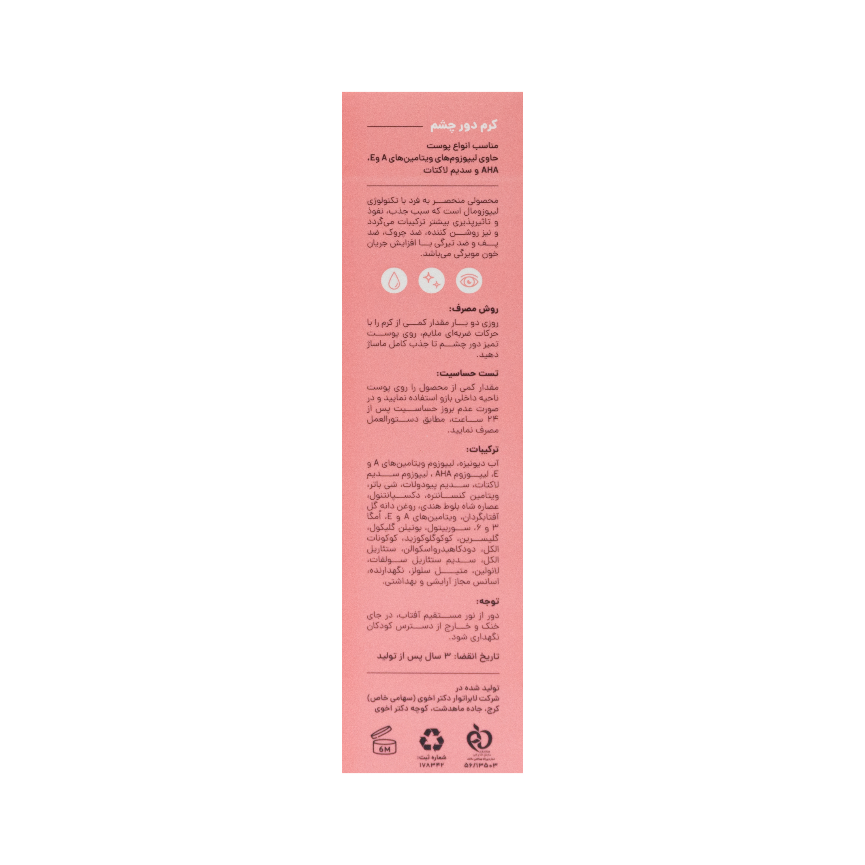 - روزی دوبار مقدار کمی از کرم را با حرکات ضربهای ملایم، روی پوست تمیز دورچشم تا جذب کامل ماساژ دهید.