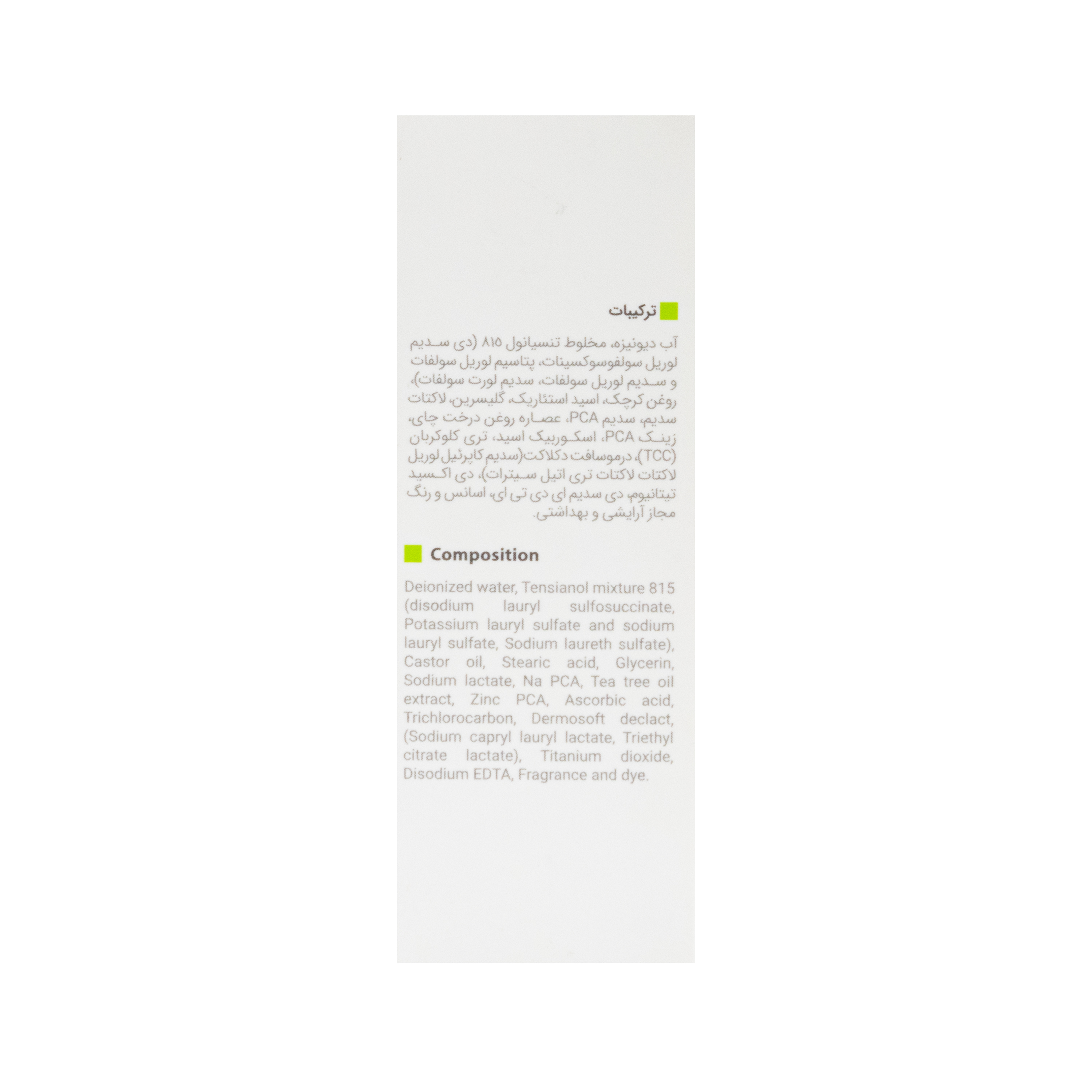 Composition: Deionized water, Tensianol mixture 815 (disodium lauryl sulfosuccinate, Potassium lauryl sulfate and sodium lauryl sulfate, Sodium laureth sulfate), Castor oil, Stearic acid, Glycerin, Sodium lactate, Na PCA, Tea tree oil extract, Zinc PCA, Ascorbic acid, Trichlorocarbon, Dermosoft declact, (Sodium capryl lauryl lactate, Triethyl citrate lactate), Titanium dioxide, Disodium EDTA, Fragrance and dye