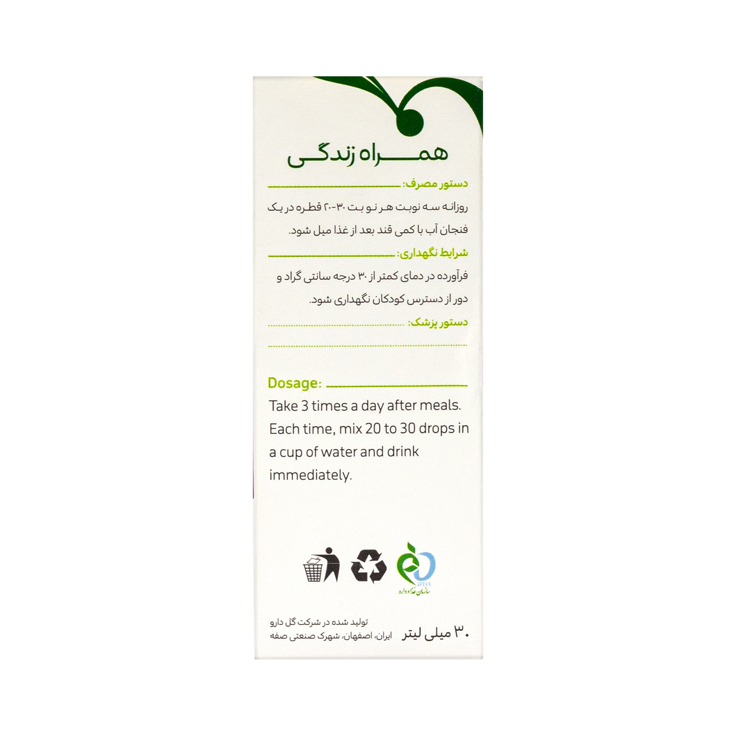 روزانه سه نوبت هر نوبت ۳۰-۲۰ قطره در یک فنجان آب با کمی قند بعد از غذا