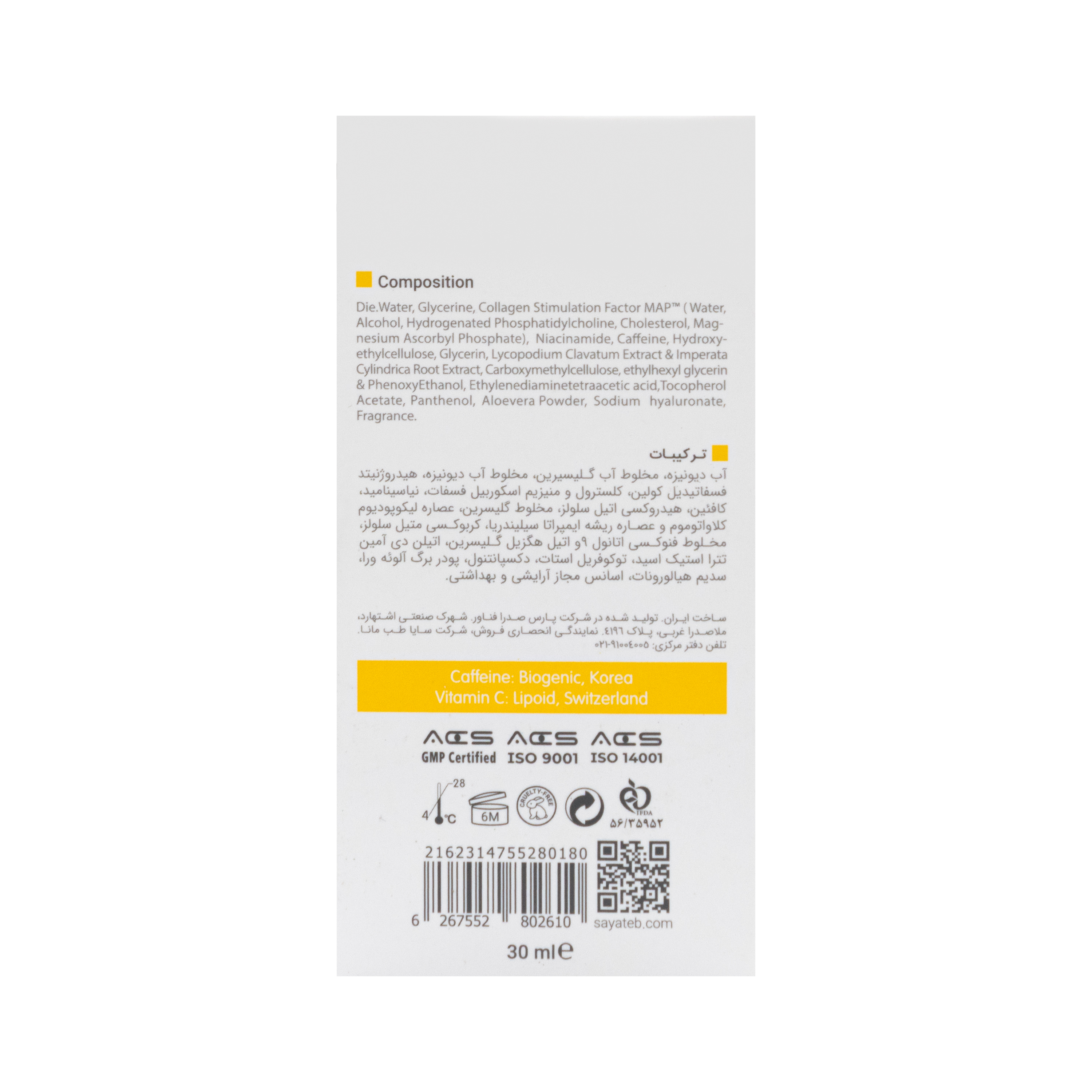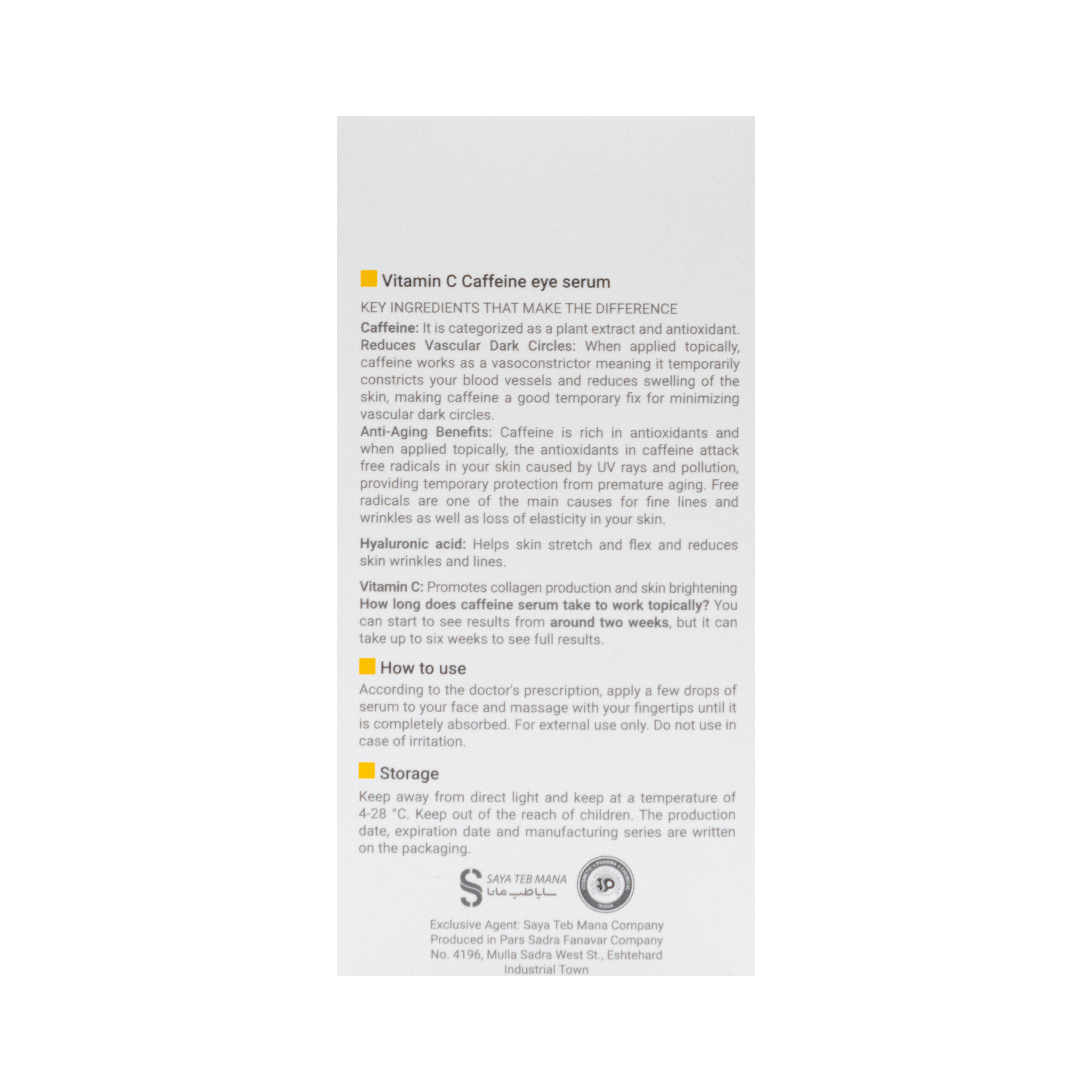 - کافئین 5%، ویتامین سی 2%، هیالورونیک اسید 0.5%