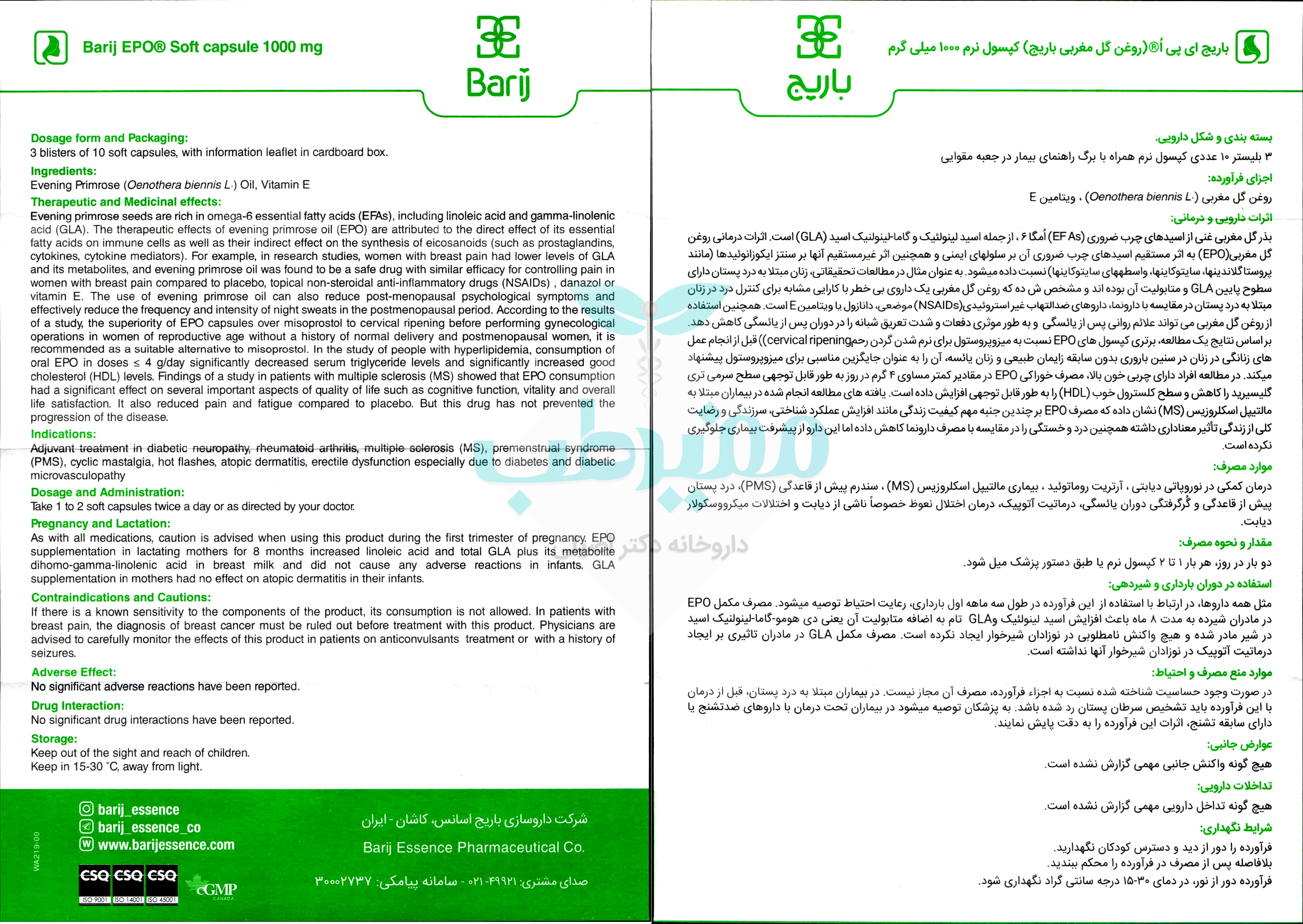 - وجود 70 تا 140 میلی گرم گاما لینولنیک اسید (GLA) در هر کپسول نرم