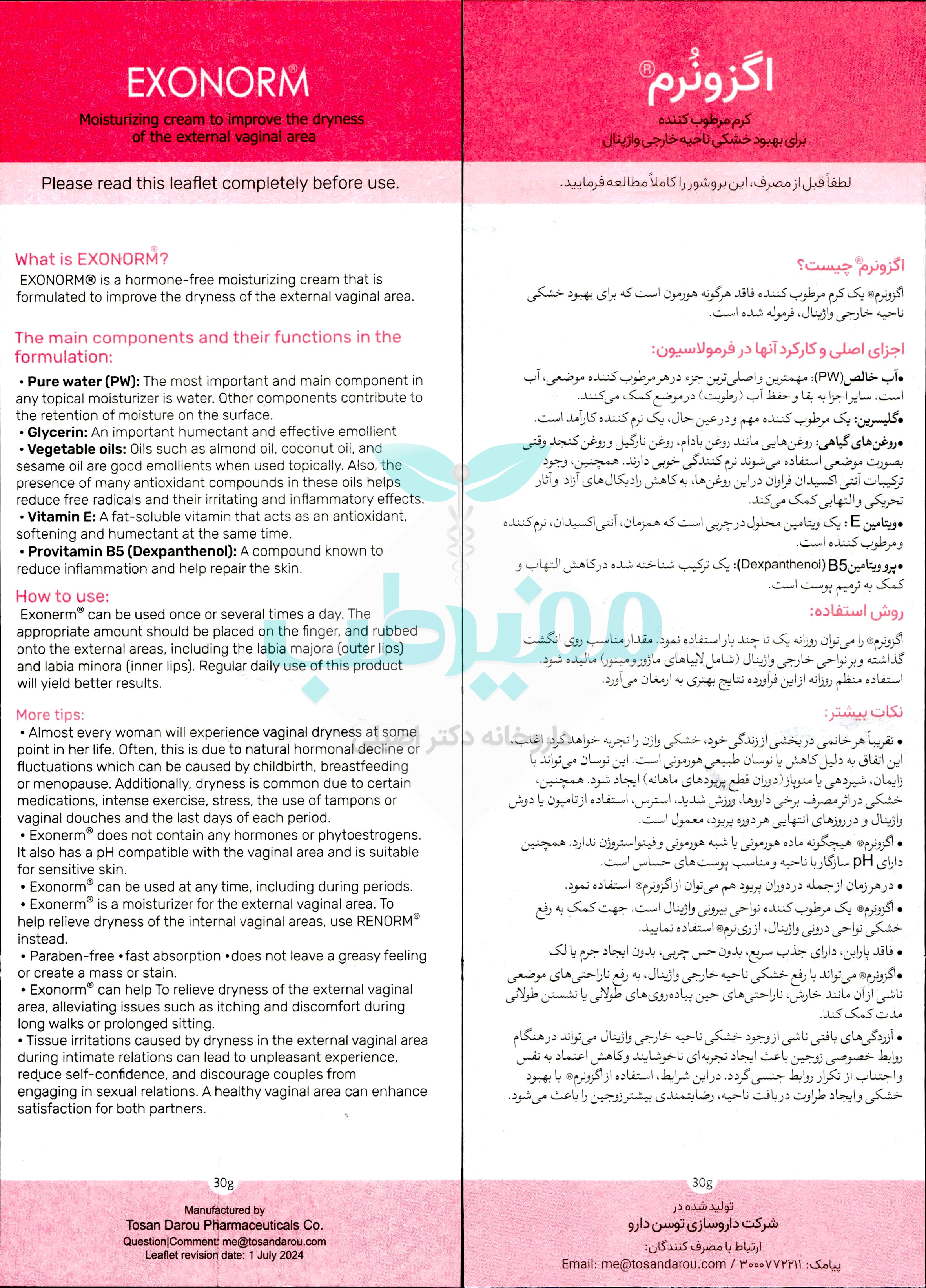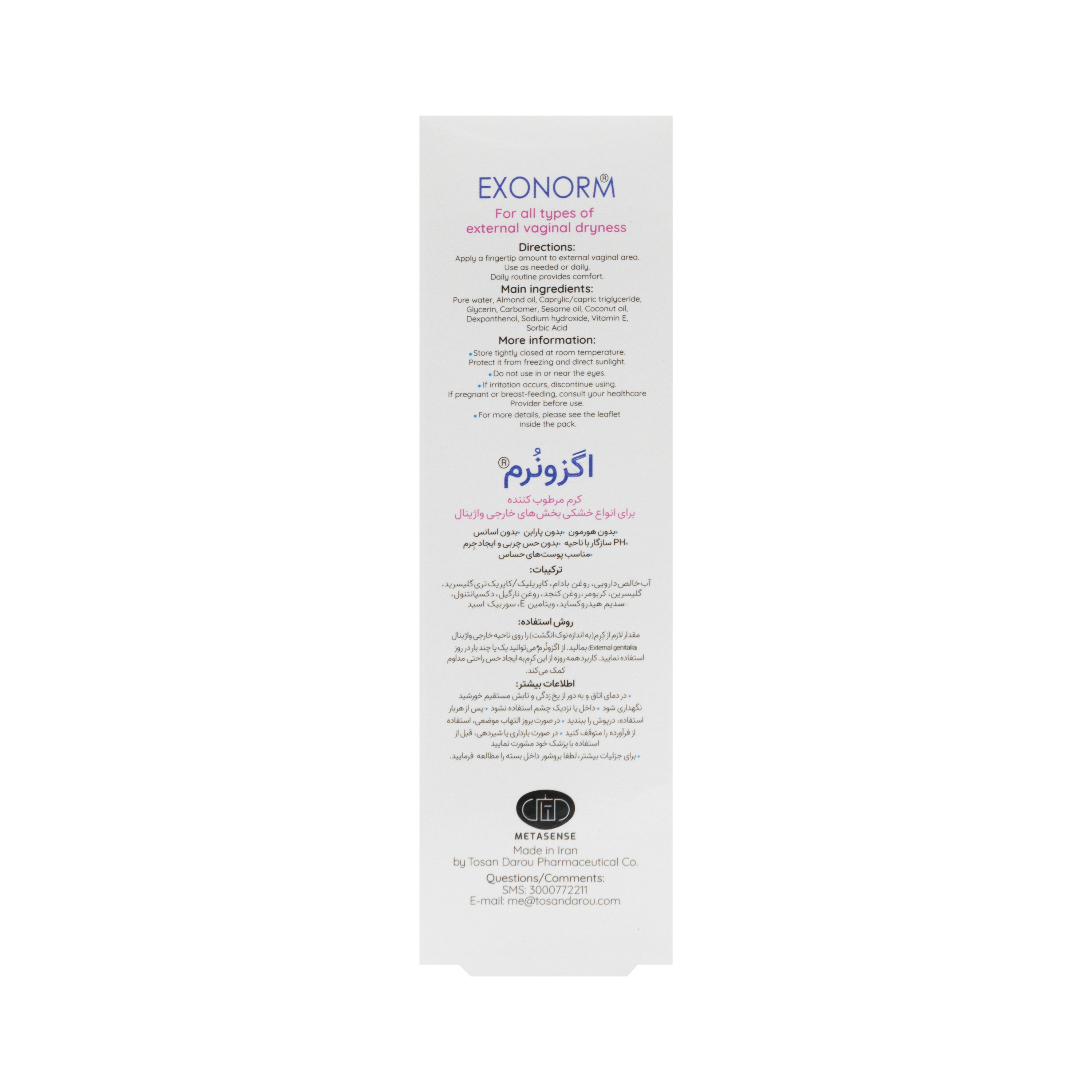 - اگزونرم یک مرطوب کننده نواحی بیرونی واژینال است. جهت کمک به رفع خشکی نواحی درونی واژینال از ری نرم استفاده نمایید.