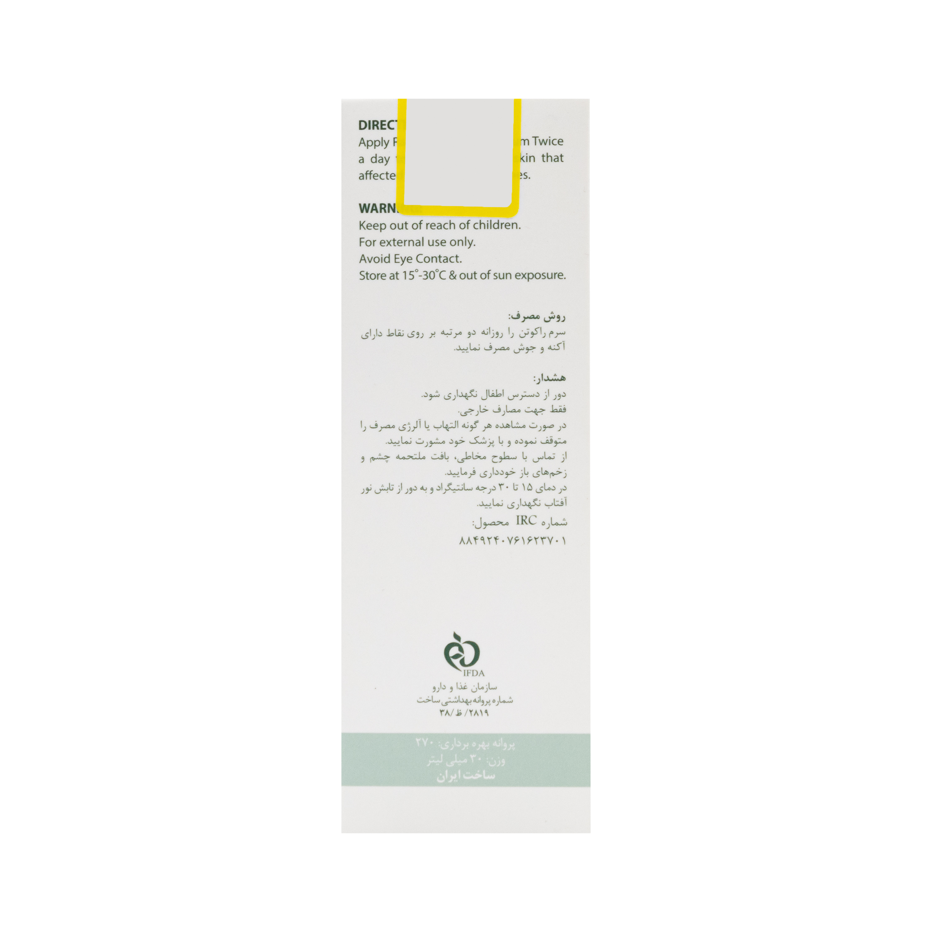 سرم آنتی آکنه راکوتن را روزانه دو مرتبه بر روی نقاط دارای آکنه و جوش مصرف نمایید.