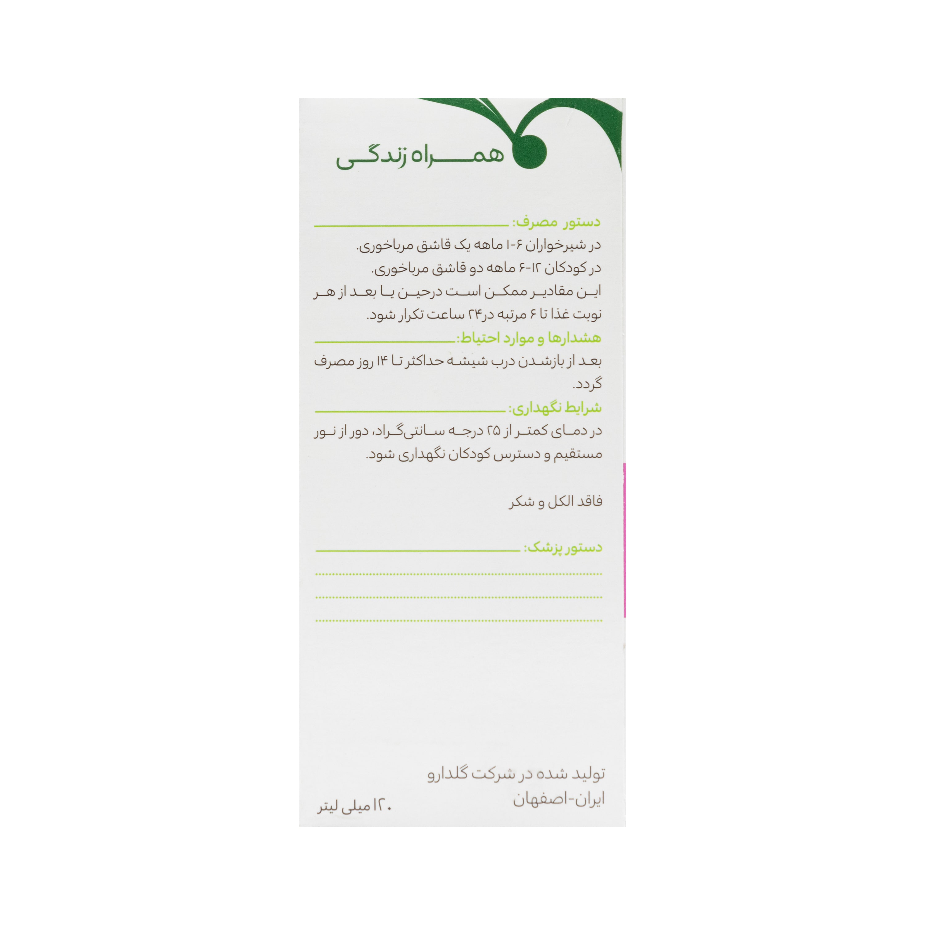 - بعد از بازشدن درب شیشه حداکثر تا ۱۴ روز مصرف گردد.