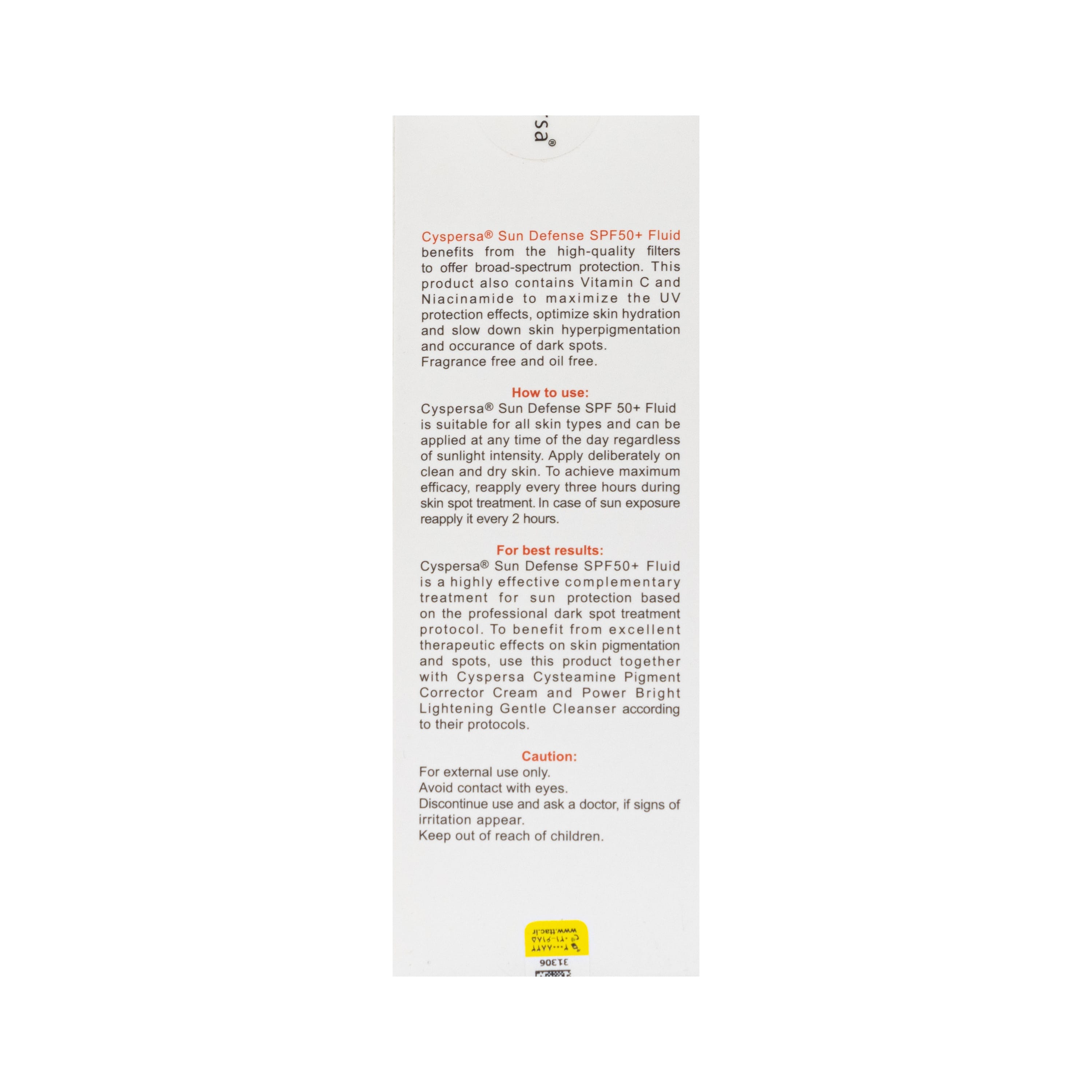 - برای بهره مندی از اثرات درمانی عالی بر روی لک های پوستی، این محصول را به همراه کرم ضد لک سیستئامین سیسپرسا و ژل شستشوی صورت ضد لک سیسپرسا استفاده نمایید.