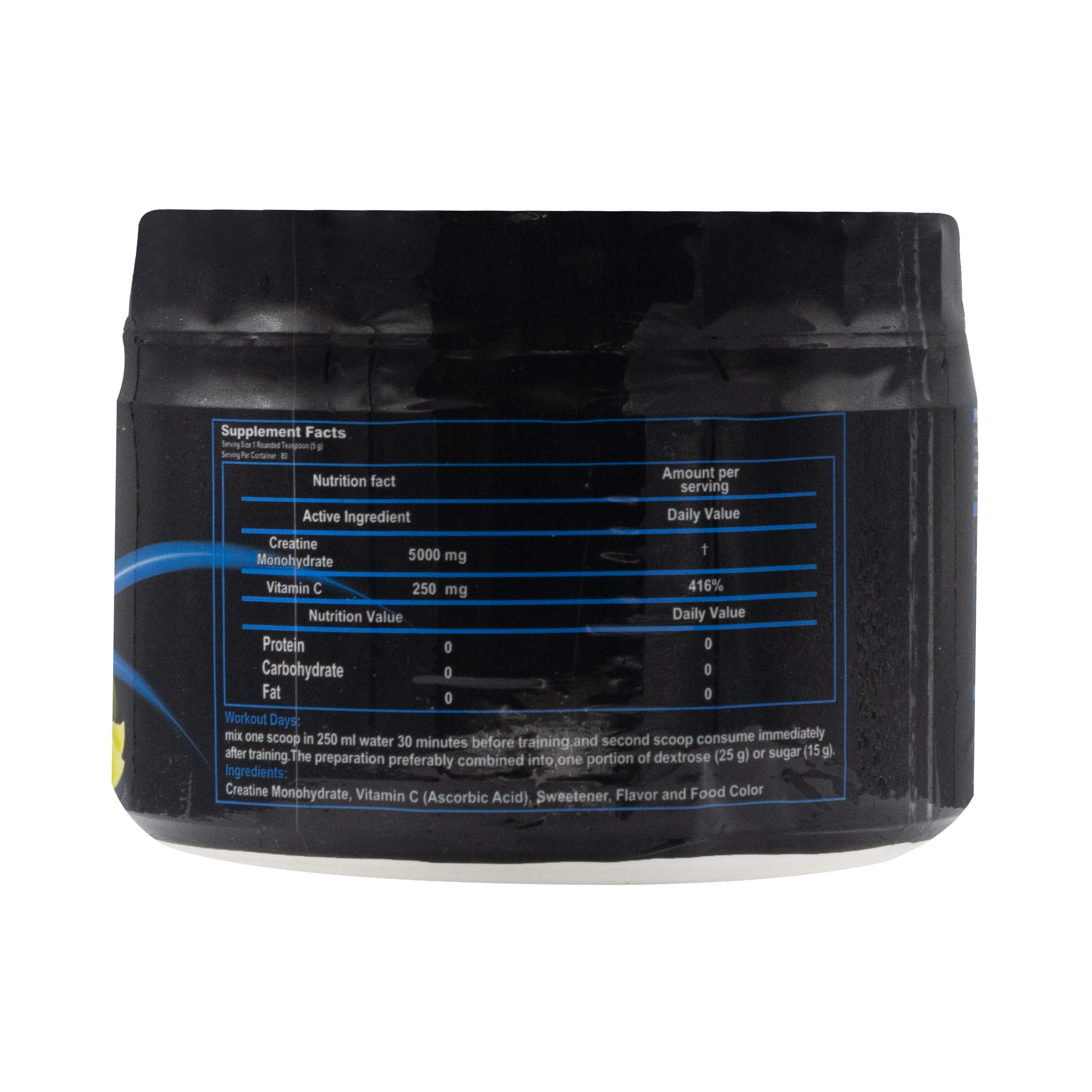 حاوی 5000 میلی گرم کراتین مونوهیدرات و 250 میلی گرم ویتامین ث (آسکوربیک اسید)