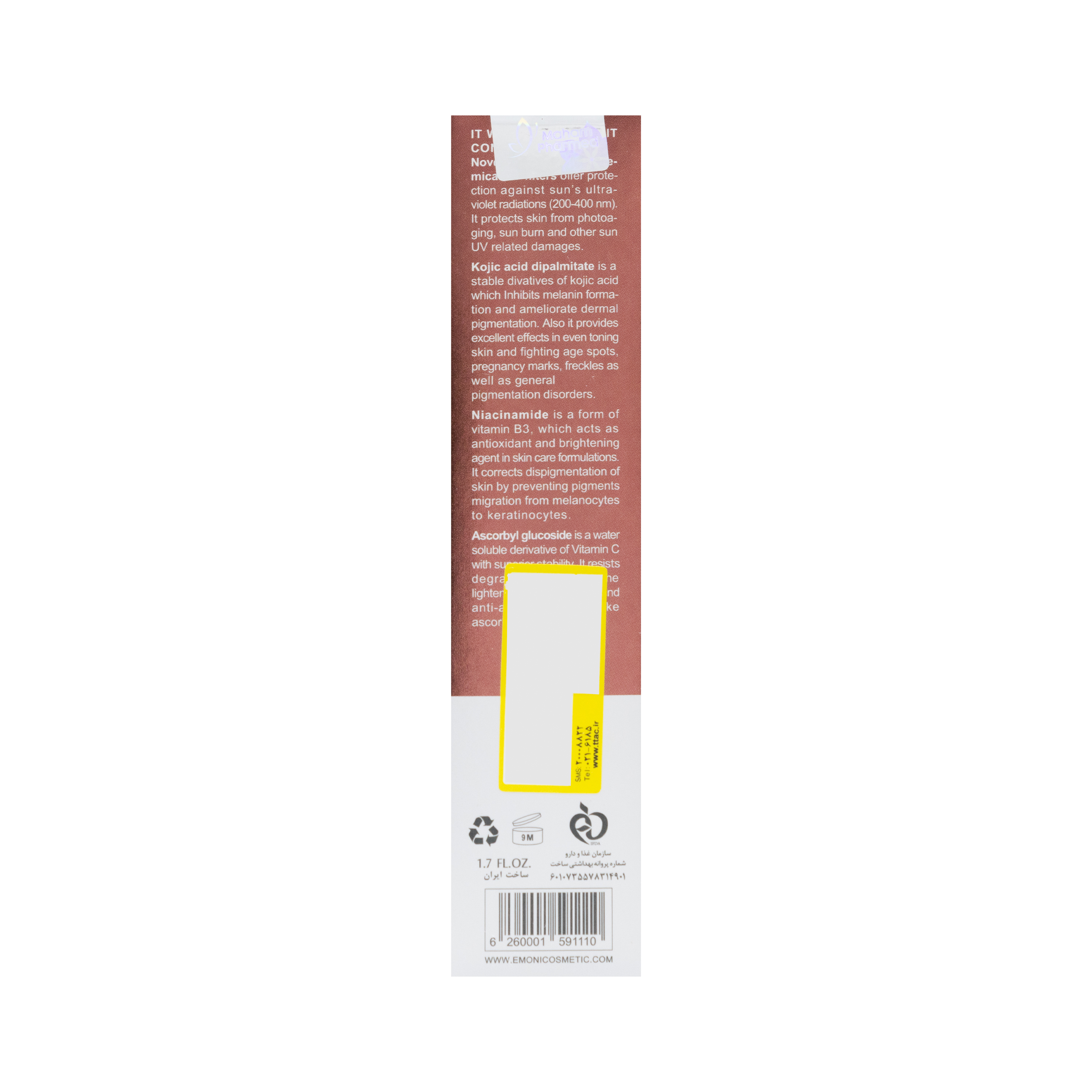 - کوجیک اسید دی پالمیتات، نیاسینامید، آسکوربیل گلیکوزاید (ویتامین C پایدار شده)