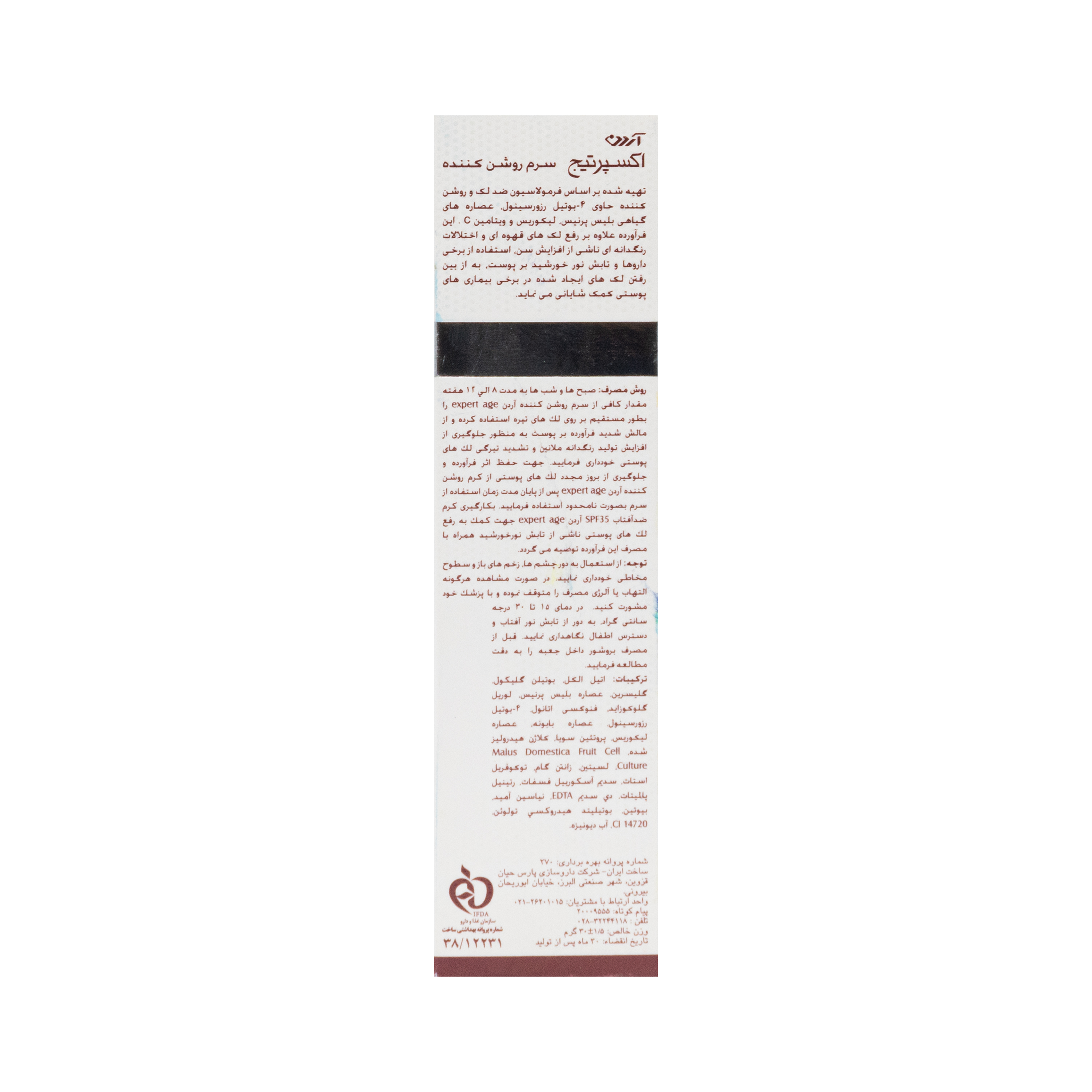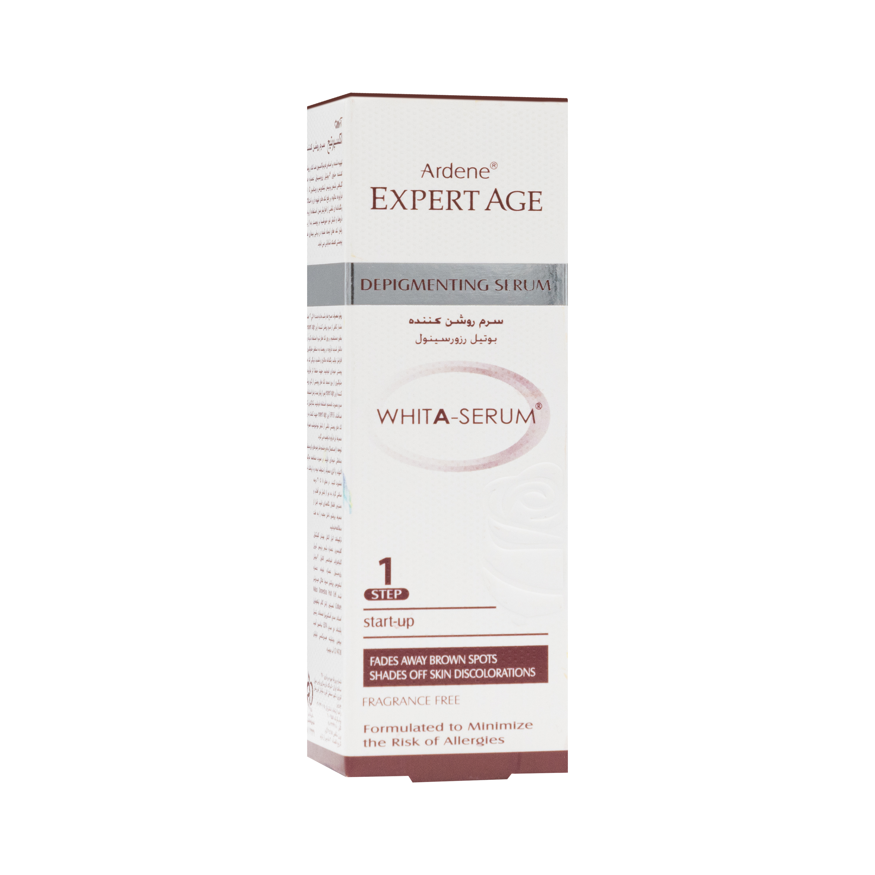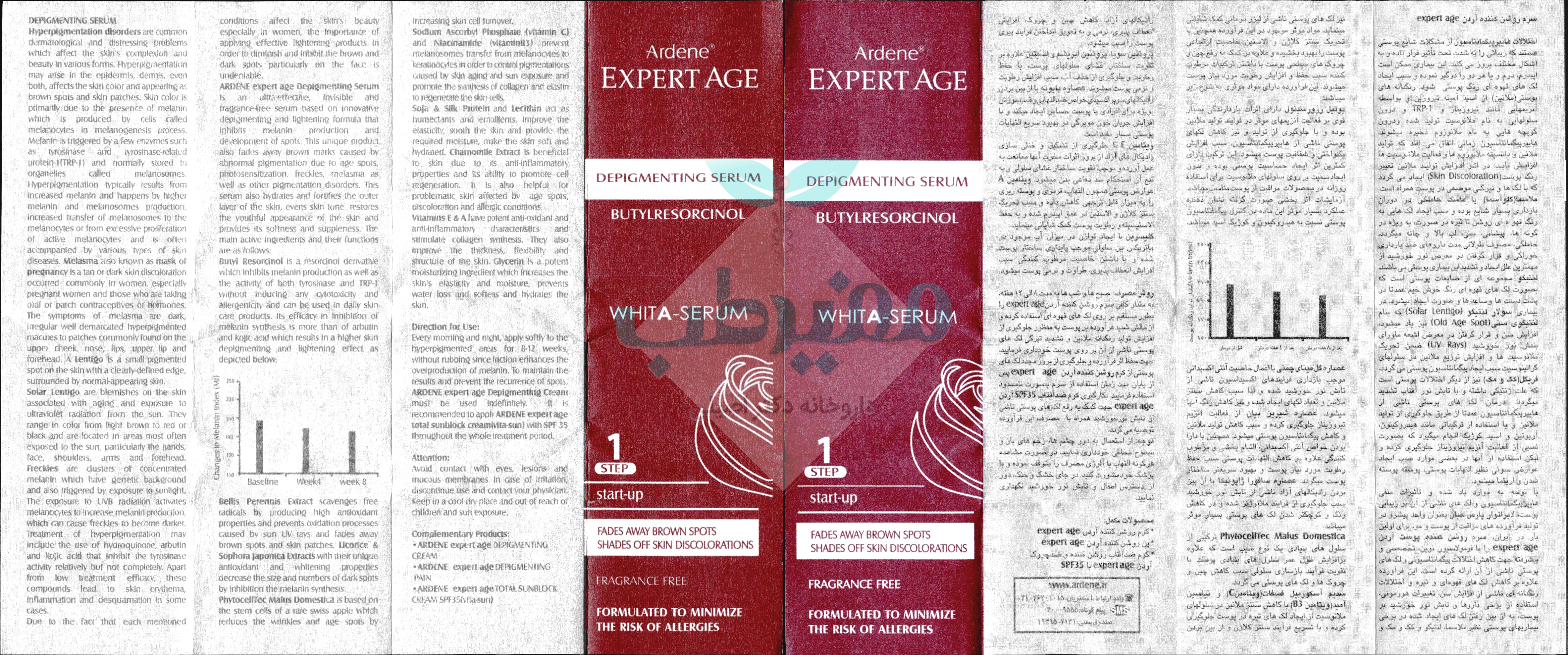 با توجه به موارد یاد شده و تاثیرات منفی هایپرپیگمانتاسیون و لک های ناشی از آن بر زیبایی پوست لابراتوار پارس حیان بعنوان واحد پیشرو در تولید فرآورده های مراقبت از پوست و مو برای اولین بار در ایران، سرم روشن کننده پوست آردن expert age را با فرمولاسیون نوین، تخصصی و پیشرفته جهت کاهش اختلالات پیگمانتاسیونی و لک های پوستی ناشی از آن ارائه کرده است. این فرآورده علاوه بر کاهش لک های قهوه ای و تیره و اختلالات رنگدانه ای ناشی از افزایش سن، تغییرات هورمونی، استفاده از برخی داروها و تابش نور خورشید بر پوست، به از بین رفتن لک های ایجاد شده در برخی بیماری های پوستی نظیر ملاسما، انتیکو و کک و مک و نیز لک های پوستی ناشی از لیزر درمانی کمک شایانی مینماید مواد موثر موجود در این فراورده همچنین تحریک سنتز کلاژن و الاستین خاصیت ارتجاعی پوست را بهبود بخشیده و علاوه بر کمک به رفع چین و چروک های سطحی پوست با داشتن ترکیبات مرطوب کننده سبب حفظ و افزایش رطوبت مورد نیاز پوست میشوند. این فرآورده دارای مواد موثری به شرح زیر میباشد: