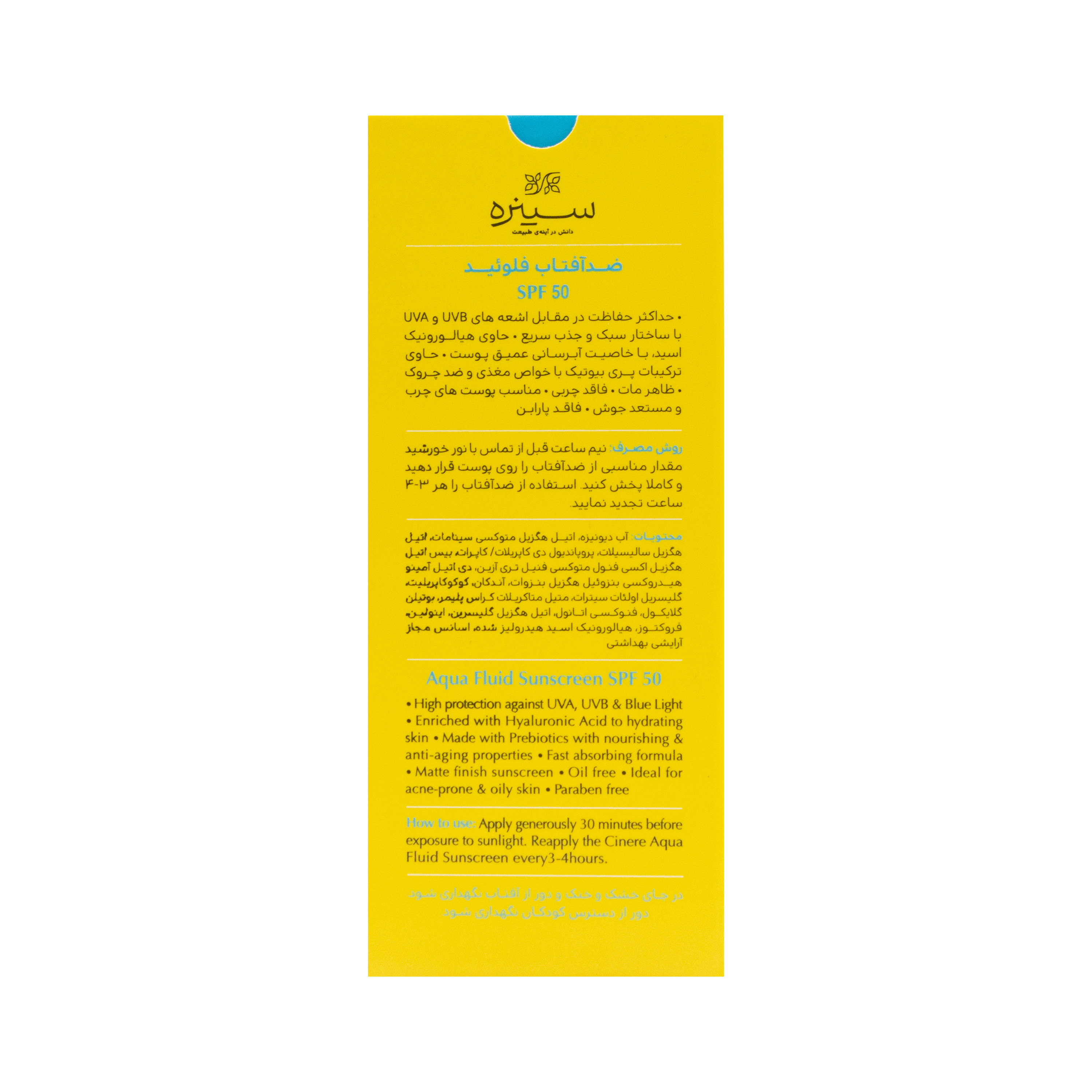 - حاوی SPF50 بافت سبک و نرمی داشته و به سرعت جذب پوست میشود. ترکیبات پریبیوتیک مورد استفاده در ضدآفتاب فلوئید سینره، رادیکالهای آزاد (عامل پیری زودرس پوست) را از بین برده، از DNA سلولهای پوست محافظت میکنند و هم چنین خاصیت ضد التهاب قوی دارند. علاوه بر این با تنظیم ترشح چربی و جلوگیری از بسته شدن منافذ پوست، از بروز جوش در پوستهای چرب جلوگیری کرد و برای انواع پوست بخصوص پوستهای چرب و مستعد جوش کاربرد دارد.