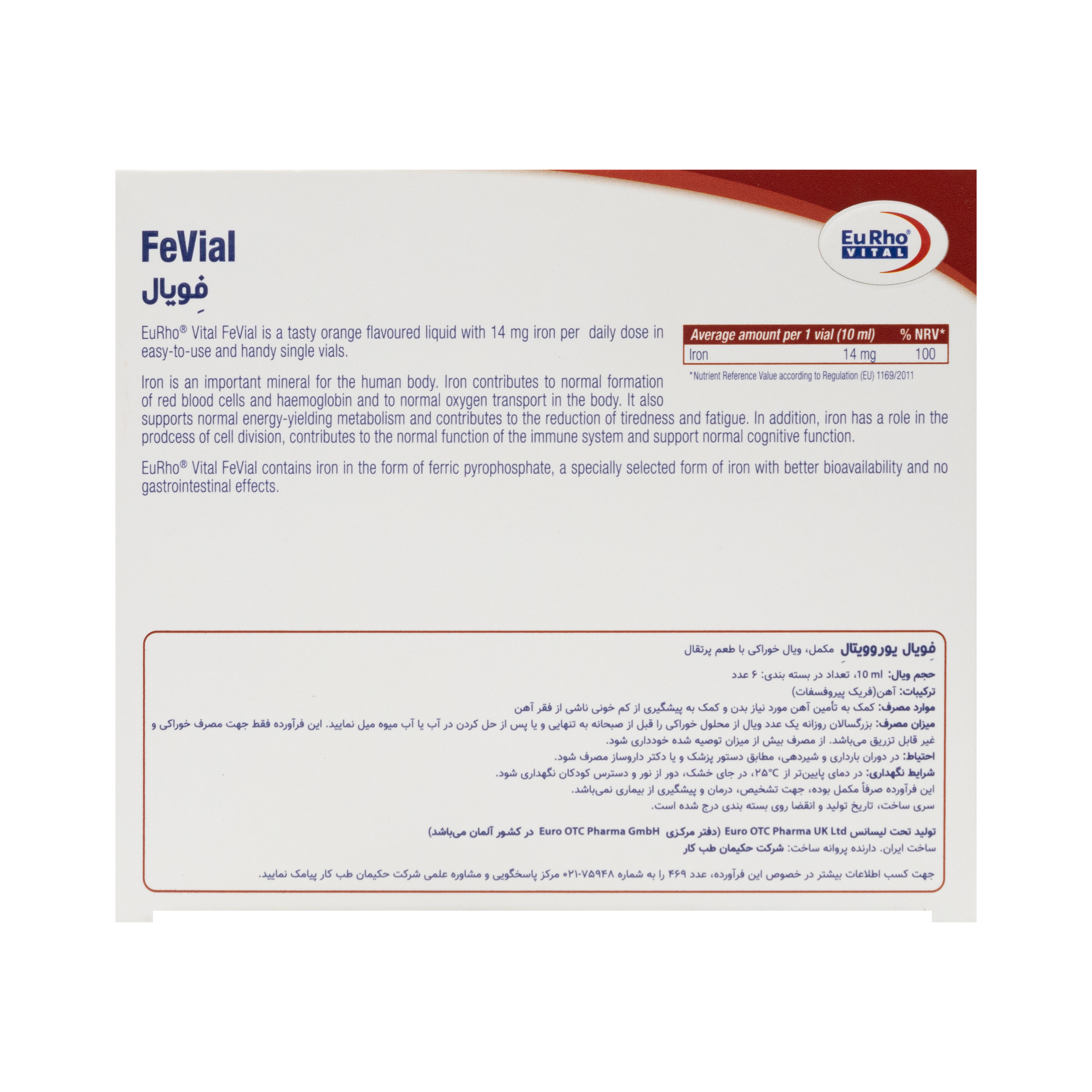 - فویال یوروویتال، ویال خوراکی آهن با طعم پرتقال است که حاوی 14 میلیگرم آهن پیروفسفات میباشد. آهن پیروفسفات زیست دسترسی و جذب بالایی دارد و بروز عوارض گوارشی آهن را به حداقل میرساند.