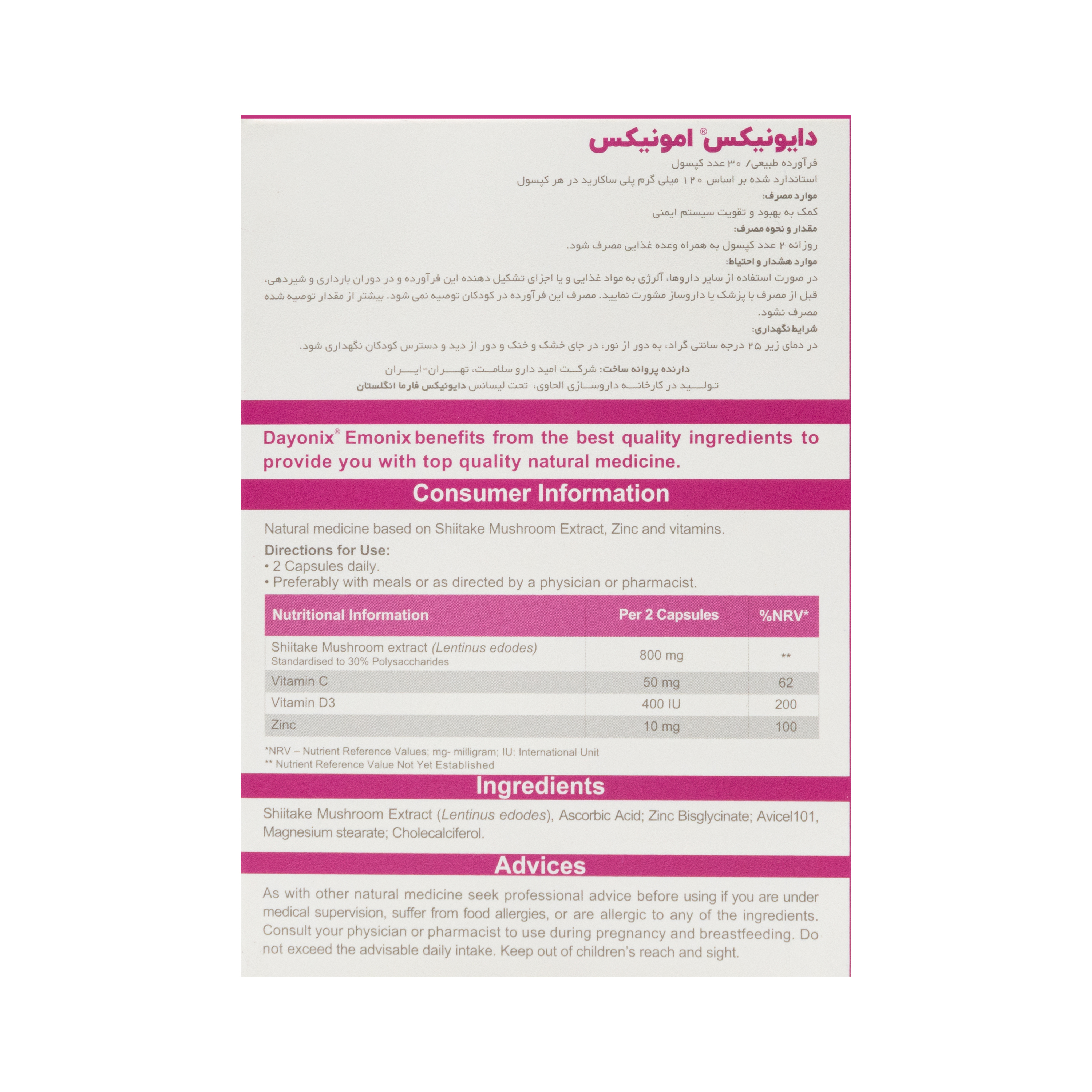 - حاوی عصاره قارچ شیتاکه، ویتامین د3، ویتامین سی و زینک