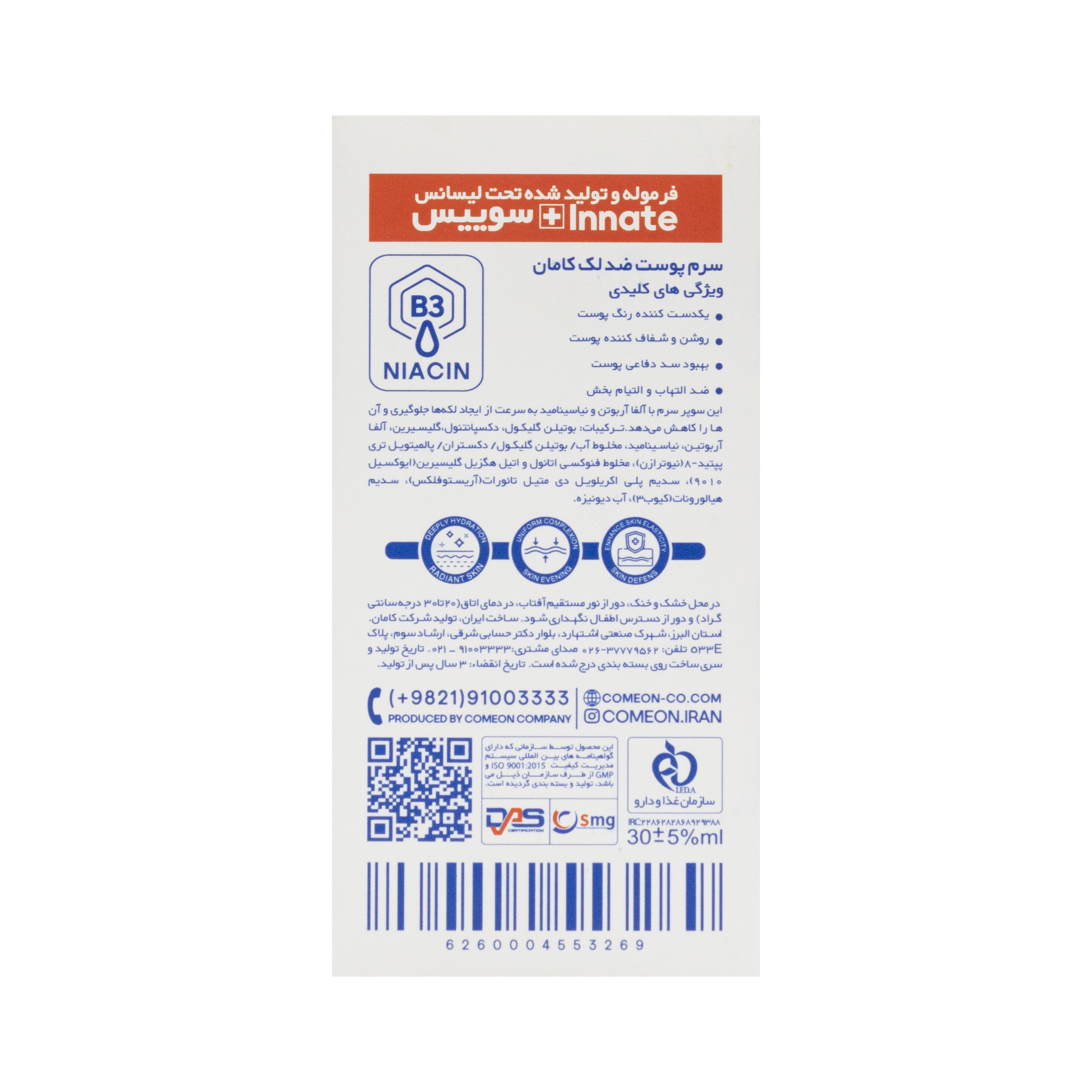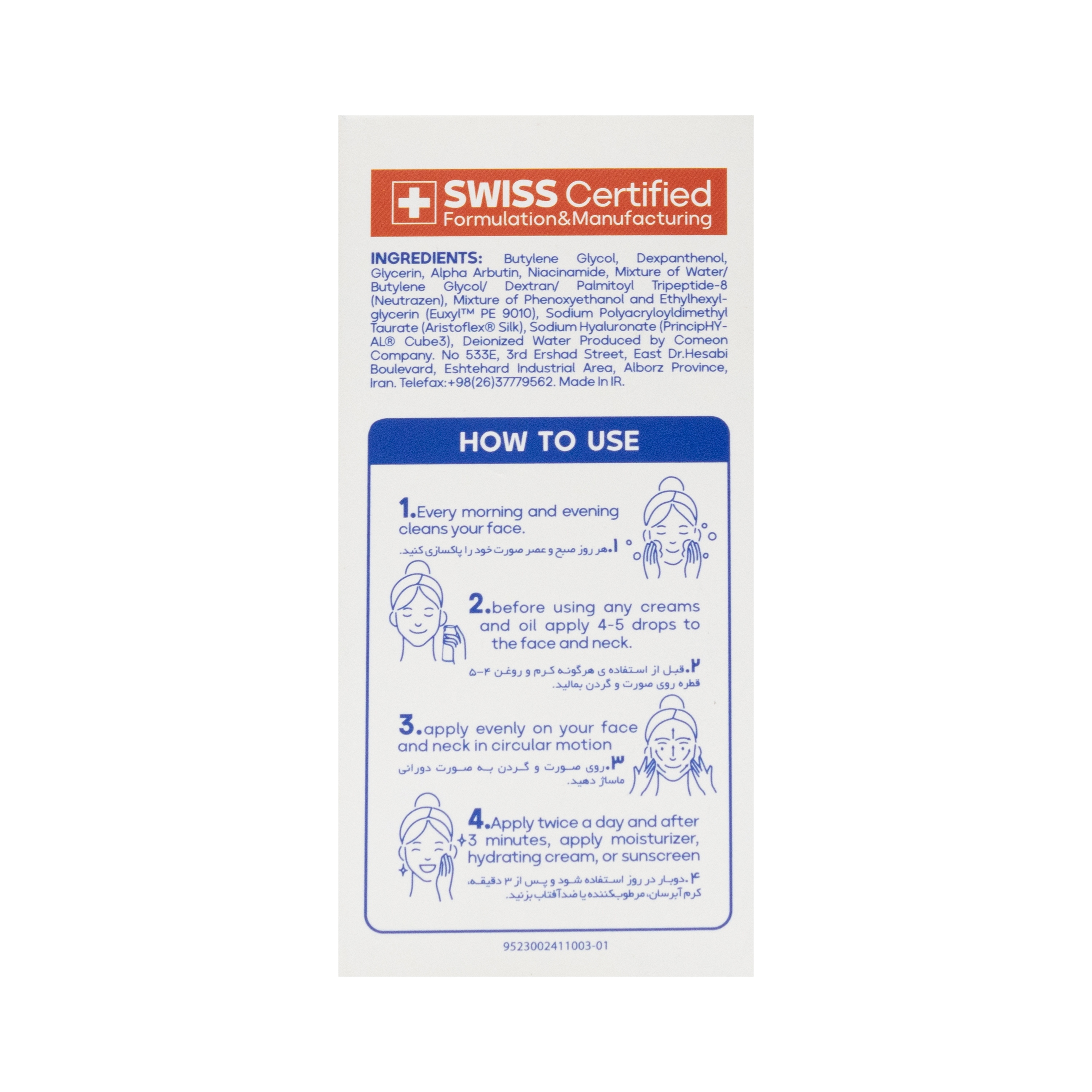 - حاوی آلفا-آربوتین و نیاسینامید، بوتیلن گلیکول، دکسپانتنول، گلیسیرین