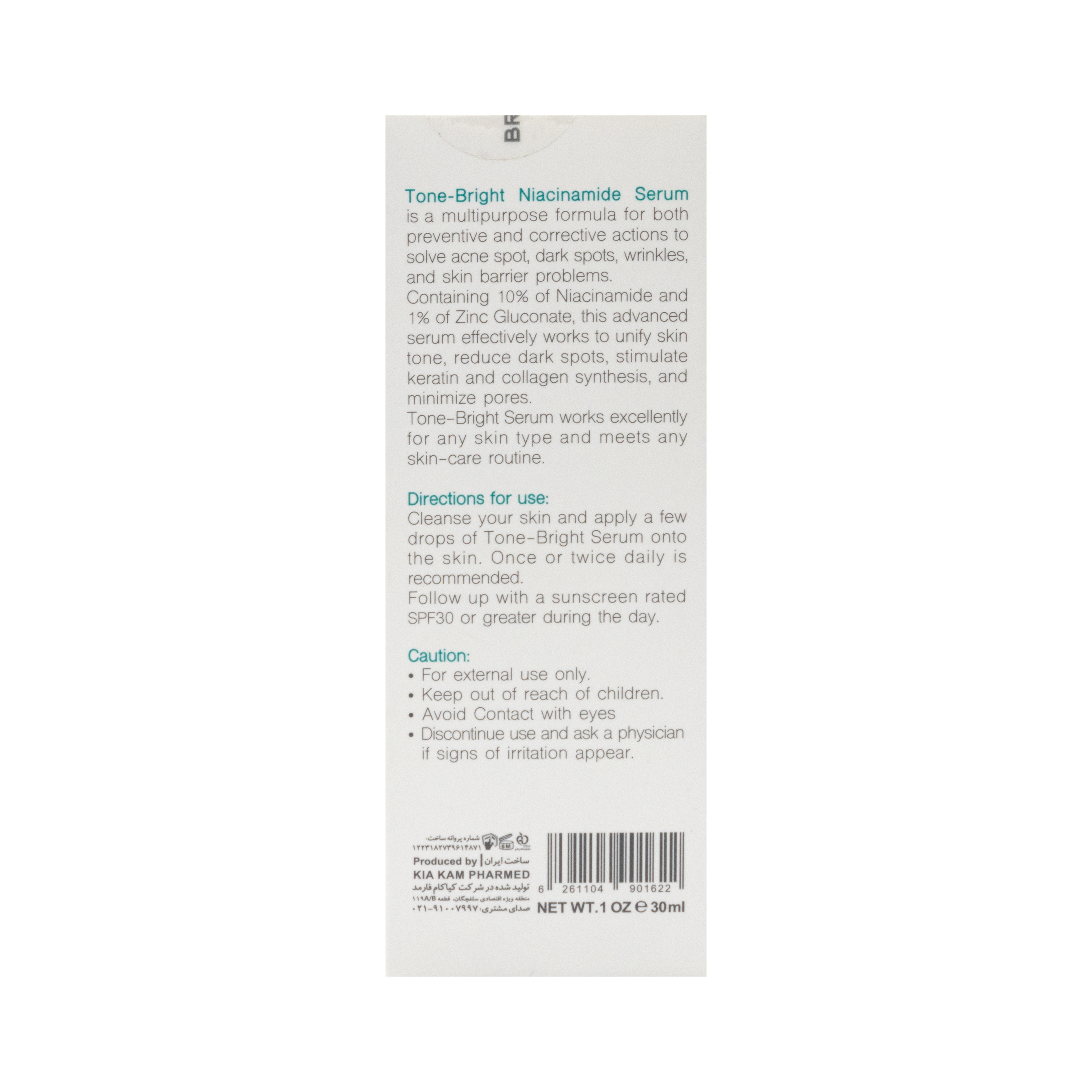 - حاوی 10% نیاسینامید و %1 زینک گلوکونات به صورت تخصصی برای یکدست سازی رنگ و بافت پوست طراحی شده است. این محصول با کاهش تیرگی لک ها، کوچک کردن منافذ، تنظیم چربی پوست و کمک به کلاژن سازی باعث احیاء ساختار طبیعی پوست و زیبایی آن می شود. سرم تن-برایت برای انواع پوست و نیز با سایر روتین های درمانی قابل استفاده است.