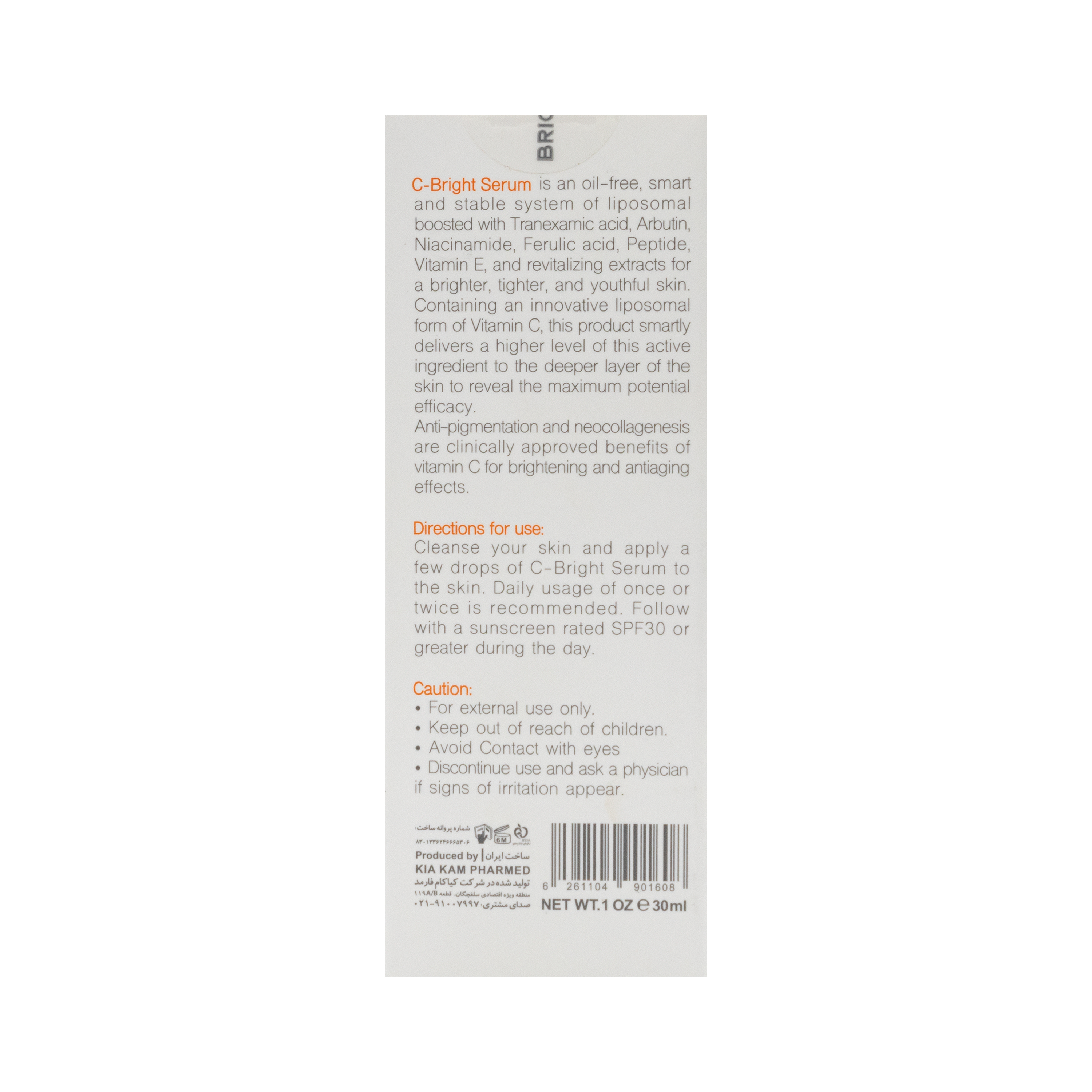- ترانگزامیک اسید در سرم ویتامین سی برایت مکس به عنوان عامل قوی روشن کننده پوست به منظور رفع لک های ناشی از اشعه مضر خورشید مانند لک های ملاسما، آفتاب سوختگی و التهاب پوستی بکار گرفته میشود.
